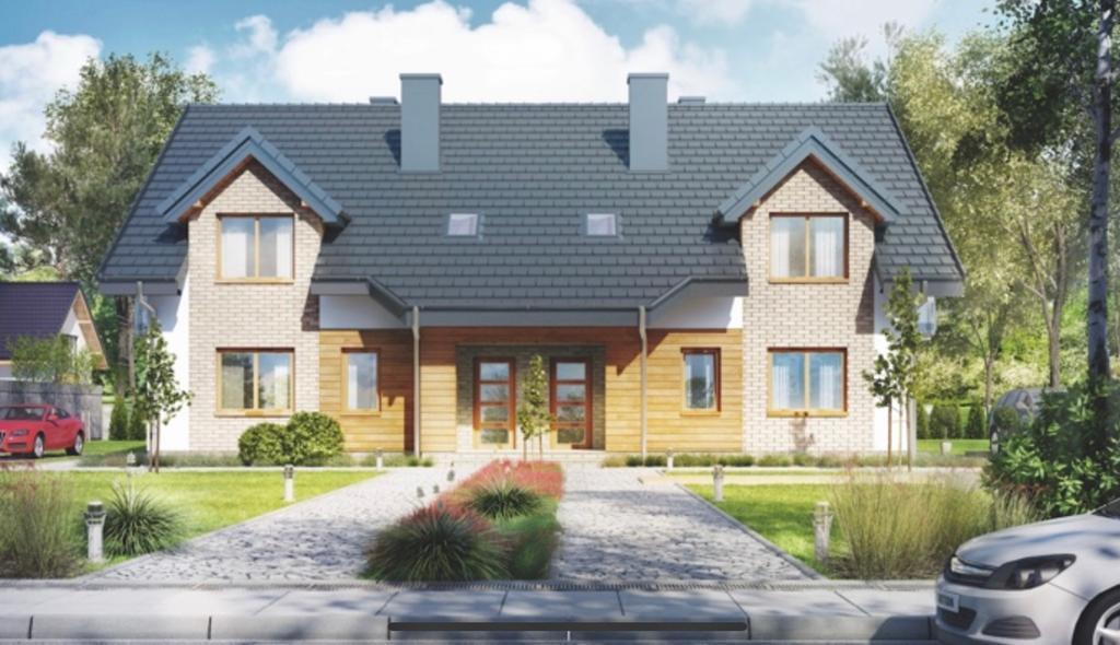 Zaprojektowany dom o nazwie - Dom wśród Malin to dwurodzinny dom, parterowy z poddaszem użytkowym przeznaczony do zabudowy bliźniaczej.