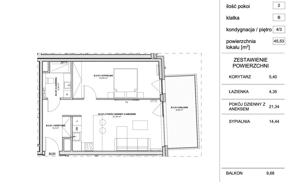Oferowane mieszkanie ma pow. 45,53 m2 i składa się z :