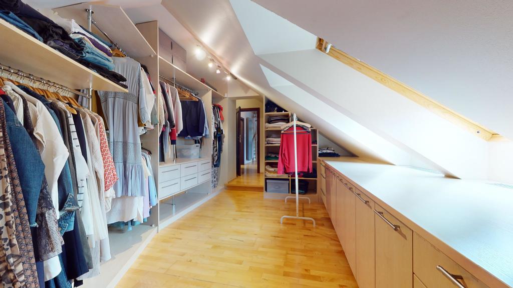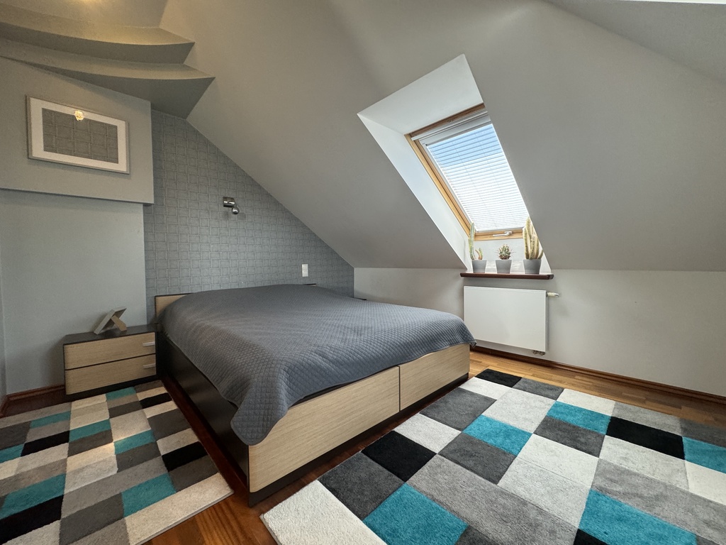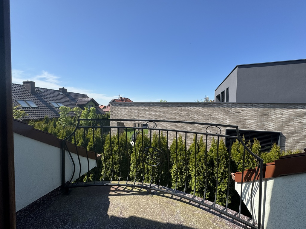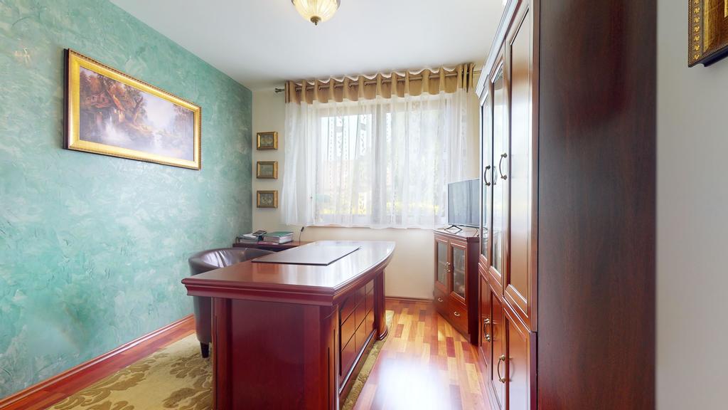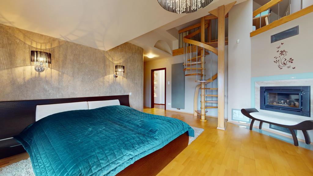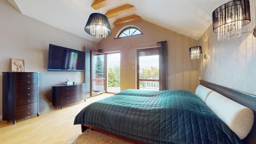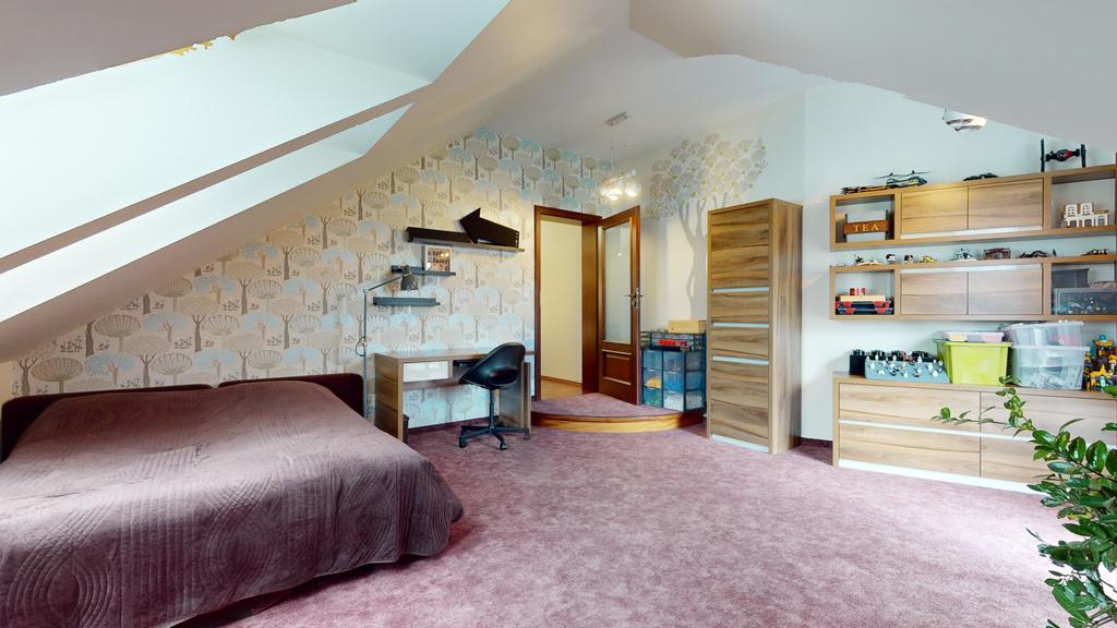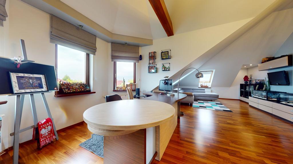 Sypialnia z balkonem, garderobą , kominkiem i częścią strychu zaaranżowana na gabinet