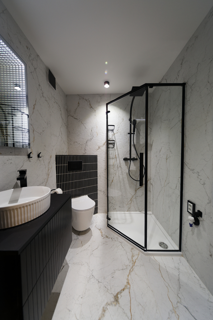 Łazienka: Przestronna, nowoczesna kabina prysznicowa ze szkła na zamówienie, miejsce na pralkę, wykończenie z najwyższej klasy materiałów