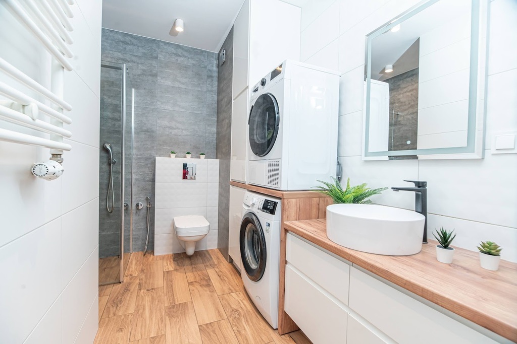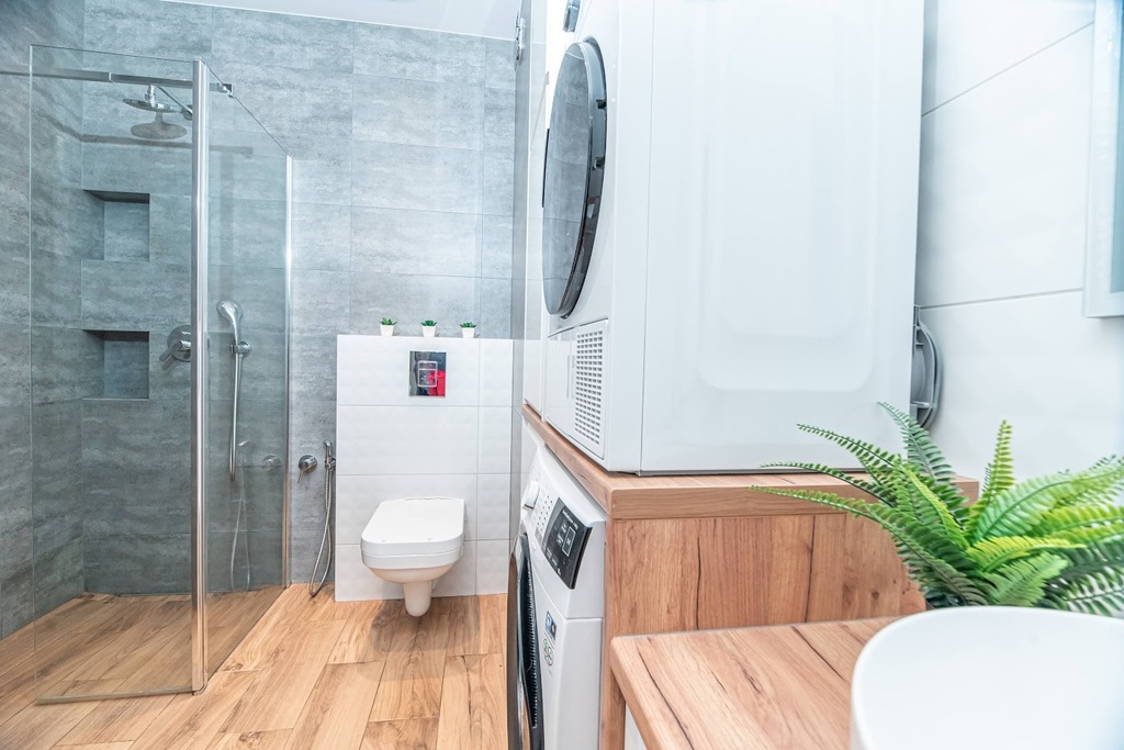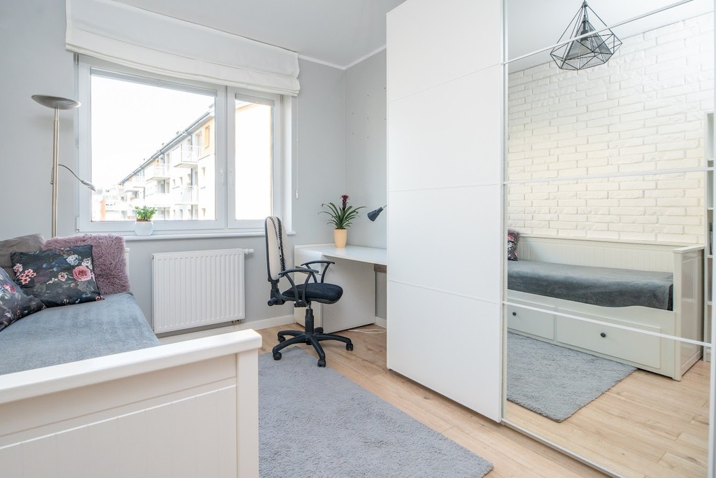 Szafy w zabudowie w korytarzu oraz w sypialni. Łazienka razem z toaletą w nowoczesnej glazurze i terakocie, kabina prysznicowa z odpływem liniowym.
