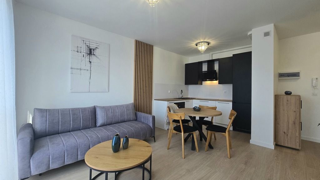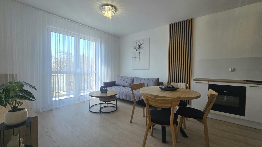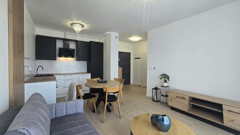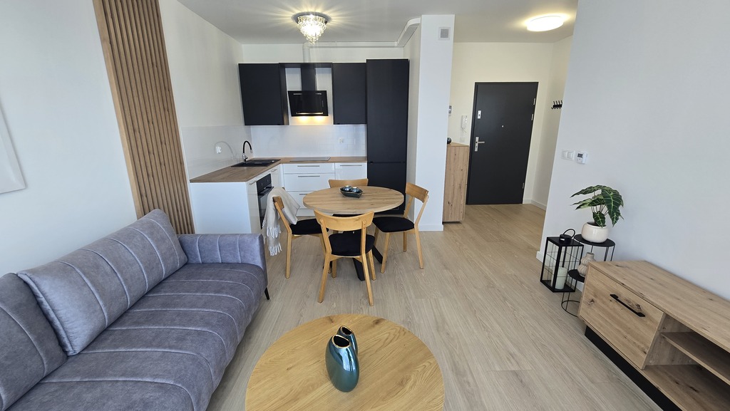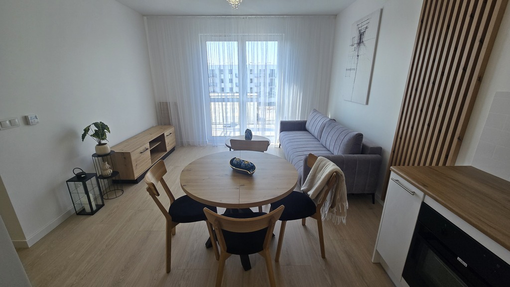 - salon z aneksem kuchennym i wyjściem na duży balkon (ponad 6 m2)