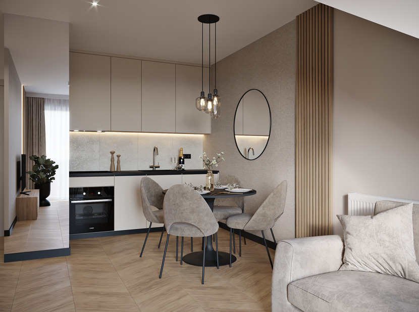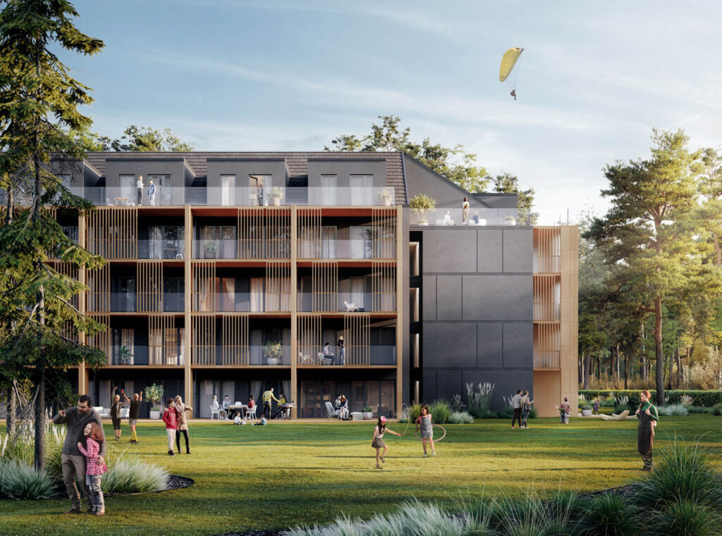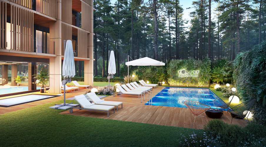 Każdy Apartament posiada wygodny aneks kuchenny oraz przestronne tarasy lub ogródki, z widokiem na las sosnowy.