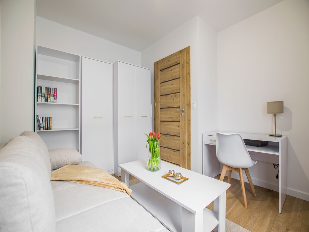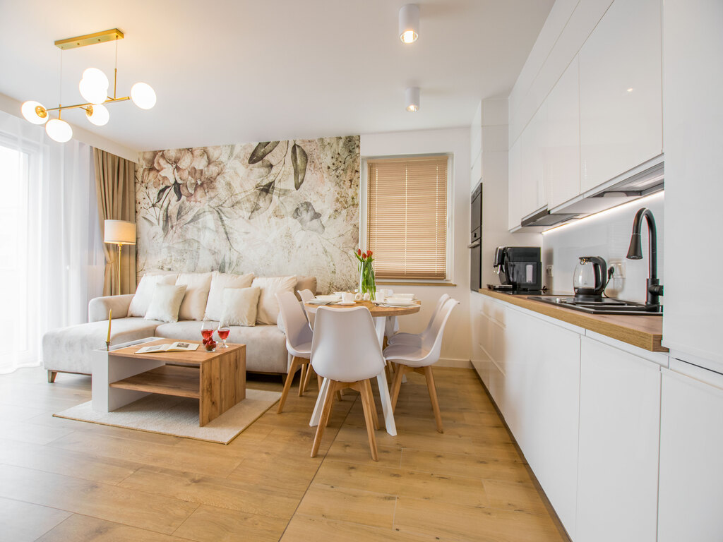 Salon z aneksem - narożna kanapa z funkcją spania, stolik kawowy, okrągły stół z krzesłami, szafka wisząca RTV, telewizor, meble kuchenne w zabudowie, zmywarka, lodówka, okap, piekarnik, płyta indukcyjna, kuchenka mikrofalowa, ekspres do kawy, elektryczny czajnik, irobot roomba, odkurzacz bezprzewodowy, toster, opiekacz,