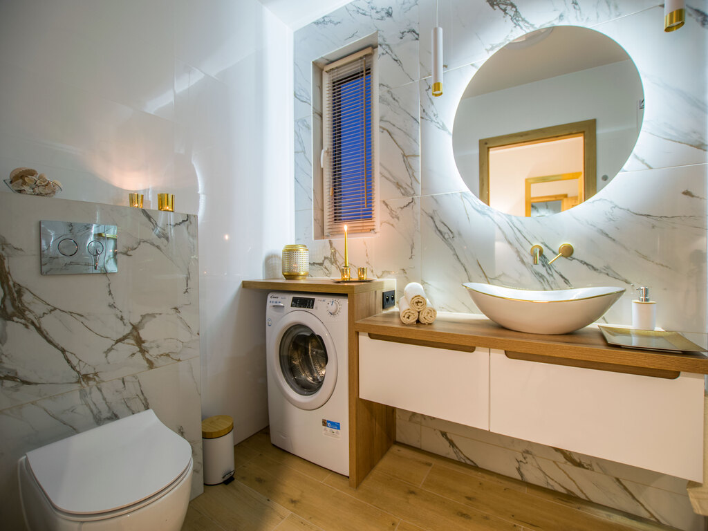 Łazienka - kabina prysznicowa, kompakt WC, pralka, umywalka z szafkami wiszącymi, lustro,