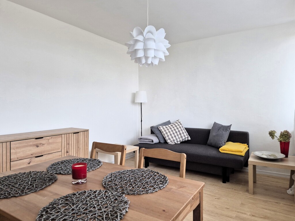 * pokój dzienny: nowa rozkładana sofa,  komoda, stół drewniany z krzesłami, stolik kawowy