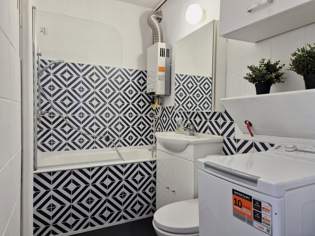 * łazienka z wanną, nowym wc, umywalką i pralką