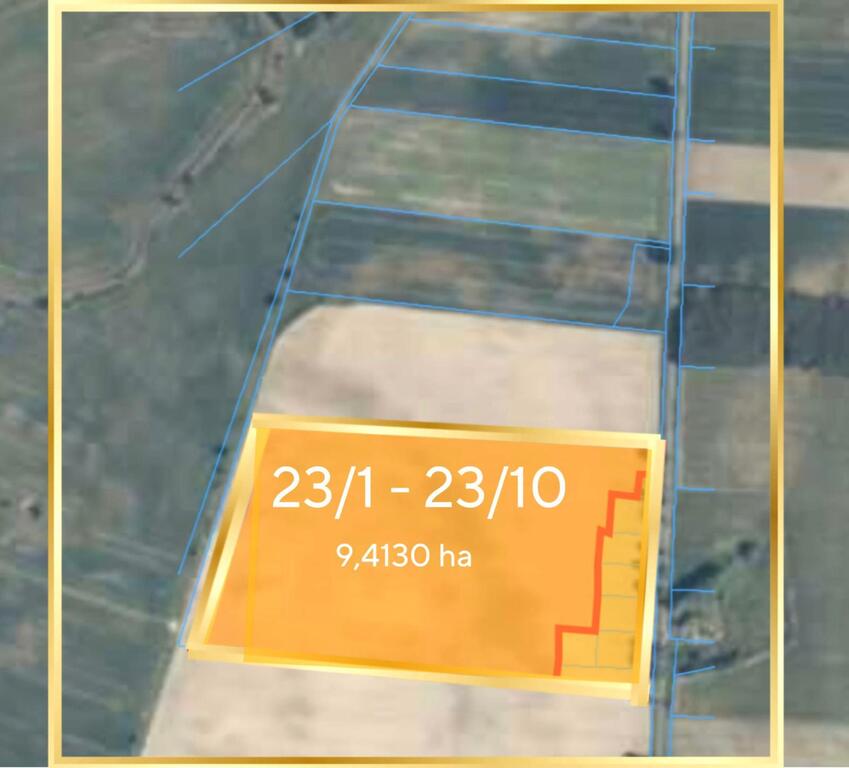 - Kompleks działek 23/1 – 23/10 – łącznie 9,4130 ha (układ idealny pod podział i zabudowę mieszkaniową).