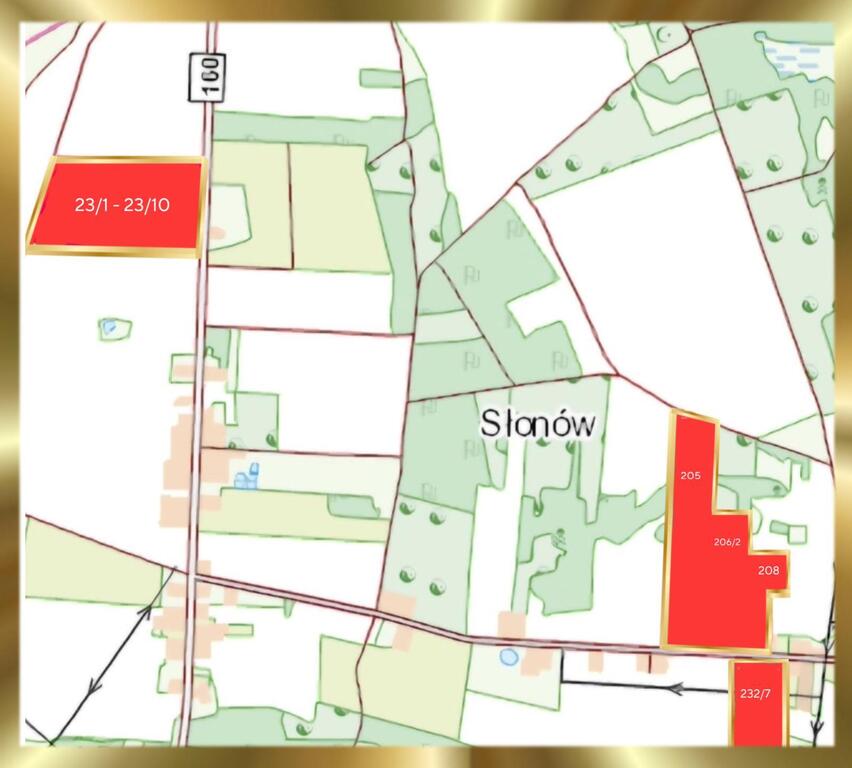 Dodatkowe informacje:Działki nr 23/1–23/10 (9,4130 ha) znajdują się w niewielkiej odległości (kilka kilometrów) od głównego kompleksu – w północno-zachodniej części Słonowa (oznaczone na mapie w lewym górnym rogu). Ich rozkład i powierzchnia idealnie nadają się pod etapowanie inwestycji deweloperskiej lub gospodarstwo rolne, sadownicze, energetyczne.