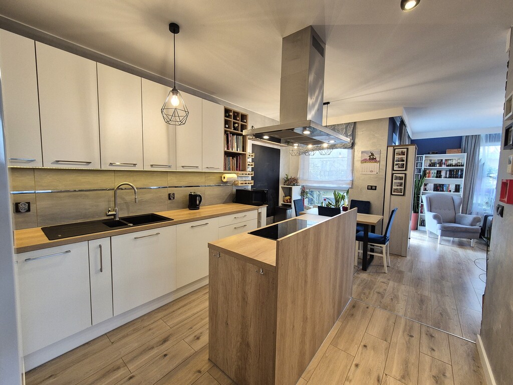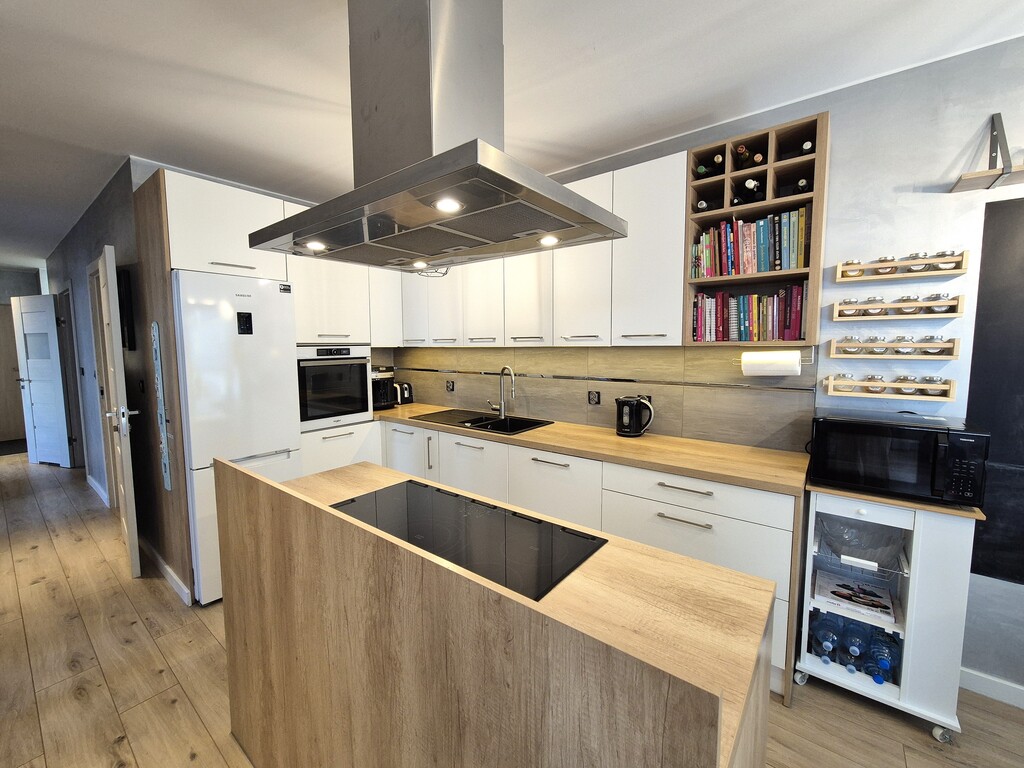 Kuchnia z wyspą - zabudowa na wymiar ze sprzętem AGD (piekarnik, zmywarka 60, lodówka, płyta indukcyjna 5-palnikowa, pochłaniacz). Salon z wielobarwnym podświetleniem led sterownym pilotem. W łazience ogrzewanie podłogowe.