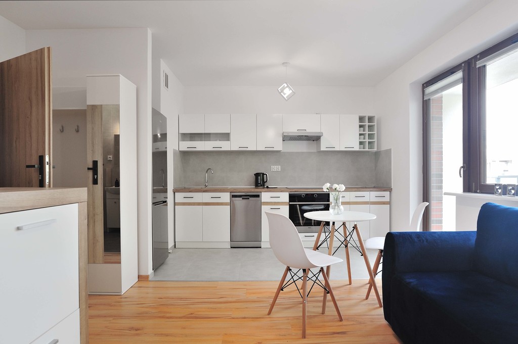 OPIS MIESZKANIA: Do wynajęcia mieszkanie znajdujące się na ostatnim piętrze IV-piętrowego budynku. Jego całkowita powierzchnia wynosi 23 m2, jest w pełni umeblowane i wyposażone. W mieszkaniu znajduje się przedpokój, salon z aneksem kuchennym (z którego jest wyjście na spory balkon), łazienka z WC. Wejście do mieszkania przez przedpokój z szafą i wieszakiem na odzież wierzchnią. Łazienka wyposażona jest w kabinę prysznicową, WC, umywalkę ze znajdującą się pod nią szafką, pralkę, lustro, wiszącą szafkę na kosmetyki. Kuchnia jest umeblowana i wyposażona w sprzęt AGD: lodówko-zamrażarkę, płytę indukcyjną, piekarnik elektryczny, zmywarkę, pochłaniacz, czajnik elektryczny. Stąd jest też wyjście na spory balkon, gdzie do dyspozycji najemców są rattanowe meble ogrodowe: stół i dwa fotele. Salon wyposażony jest w rozkładaną sofę, stolik z dwoma krzesłami, stolik kawowy, a także regał.