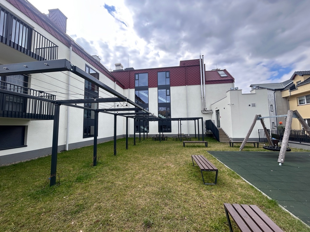 - Strefa rekreacyjna dla mieszkańców zlokalizowana na zielonym stropodachu, nad kondygnacją podziemną od wnętrza inwestycji z małym placem zabaw oraz ławkami i stolikami usytuowanymi pod zielonym tarasem