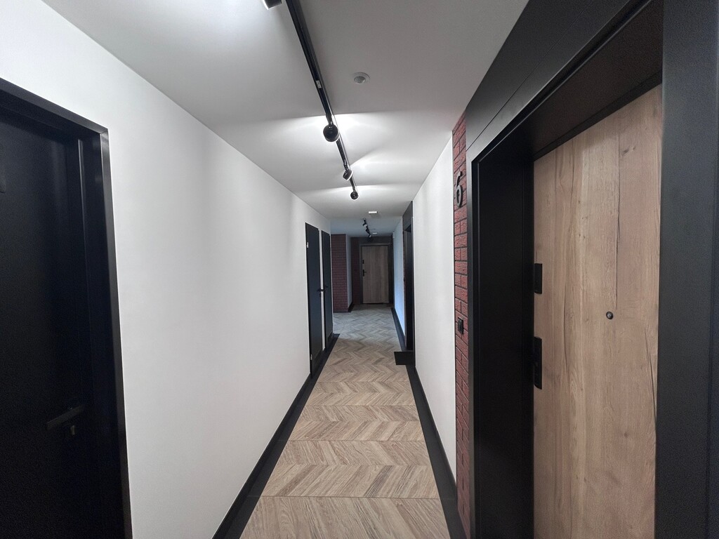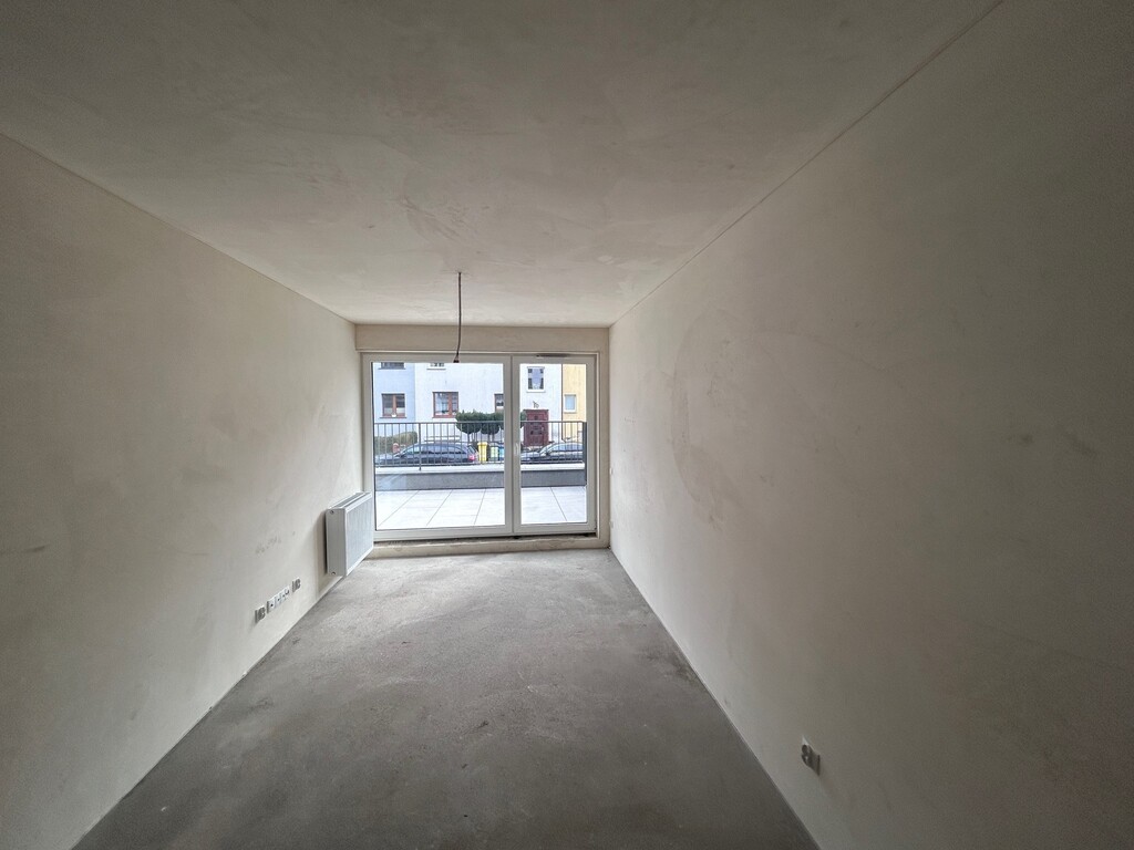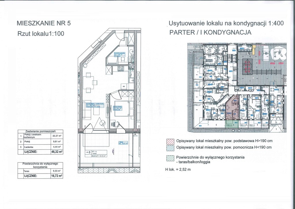 Prezentowany lokal mieszkalny ma powierzchnię 46,32 m2 i składa się z pokoju z aneksem kuchennym 32,27 m2 i wyjściem na obszerny taras 16,72 m2, sypialni 9,96 m2 oraz łazienki 4,44 m2.