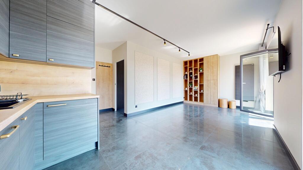 -elegancki salon z aneksem kuchennym i miejscem na stół jadalniany (z pokoju jest pierwsze wyjście na taras)