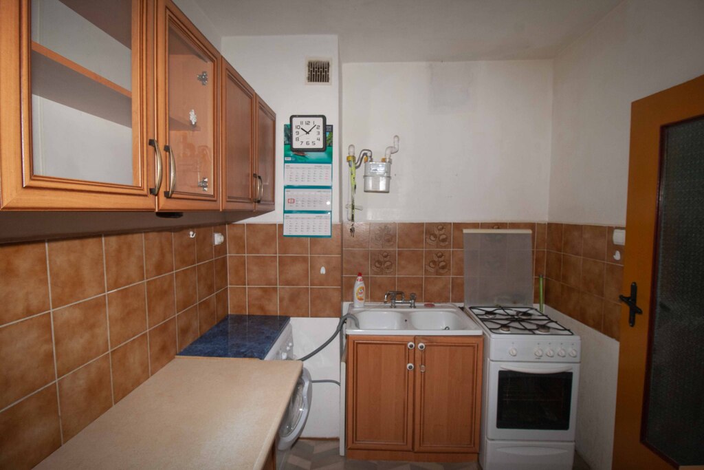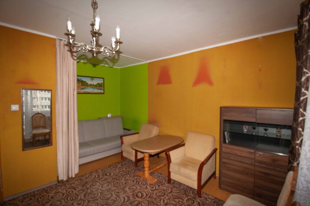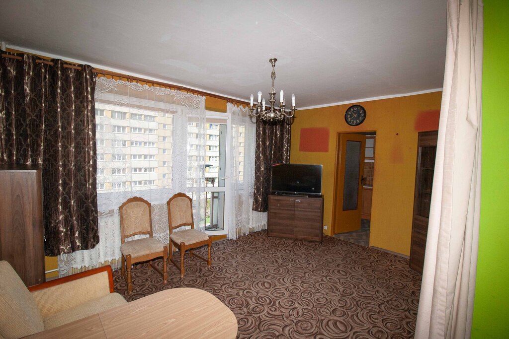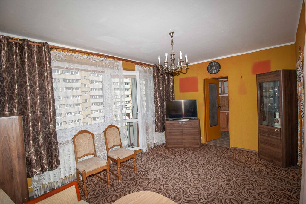 Mieszkanie składa się z przestronnego pokoju z wnęką (ok. 20 m²), widnej kuchni (ok. 5 m²) oraz łazienki z WC (ok. 4 m²), wyposażonej w wannę, glazurę i terakotę, przedpokoju ok 2 m2. Salon z porfenetr. Wnętrze w średnim stanie technicznym – na podłogach linoleum, ściany wykończone tapetą, okna PCV.