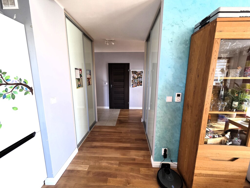 - korytarz z szafami w zabudowie.