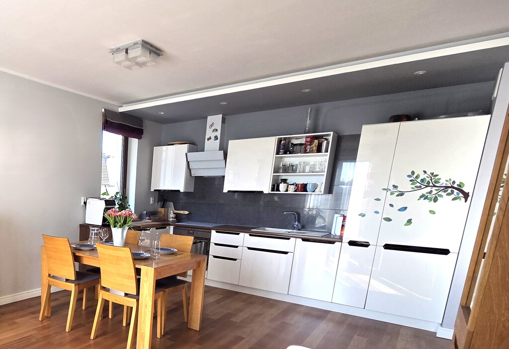 - salon z aneksem kuchennym oraz wyjściem na balkon, z którego rozpościera się przyjemny dla oka widok,