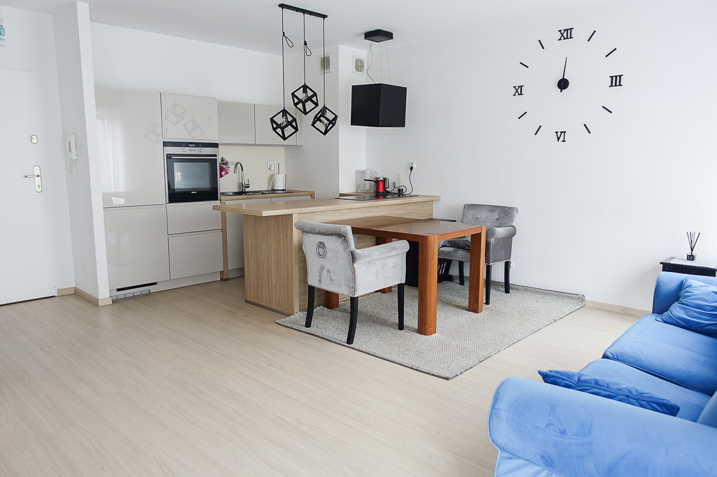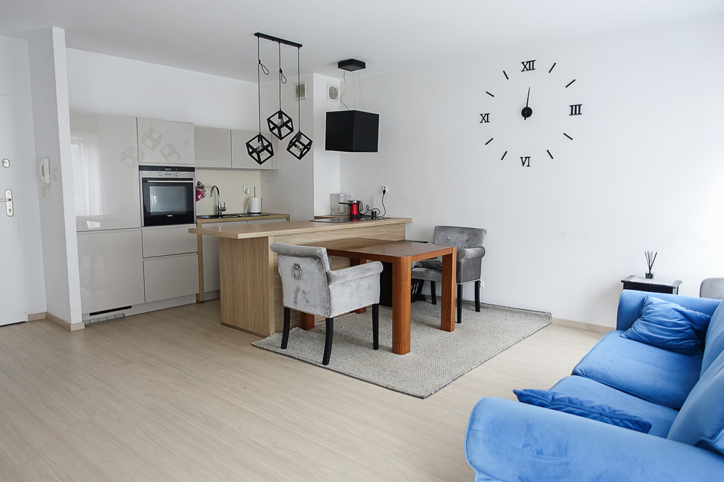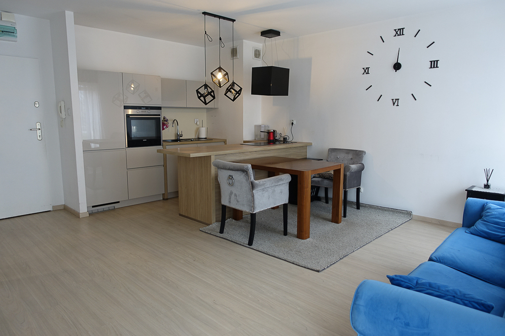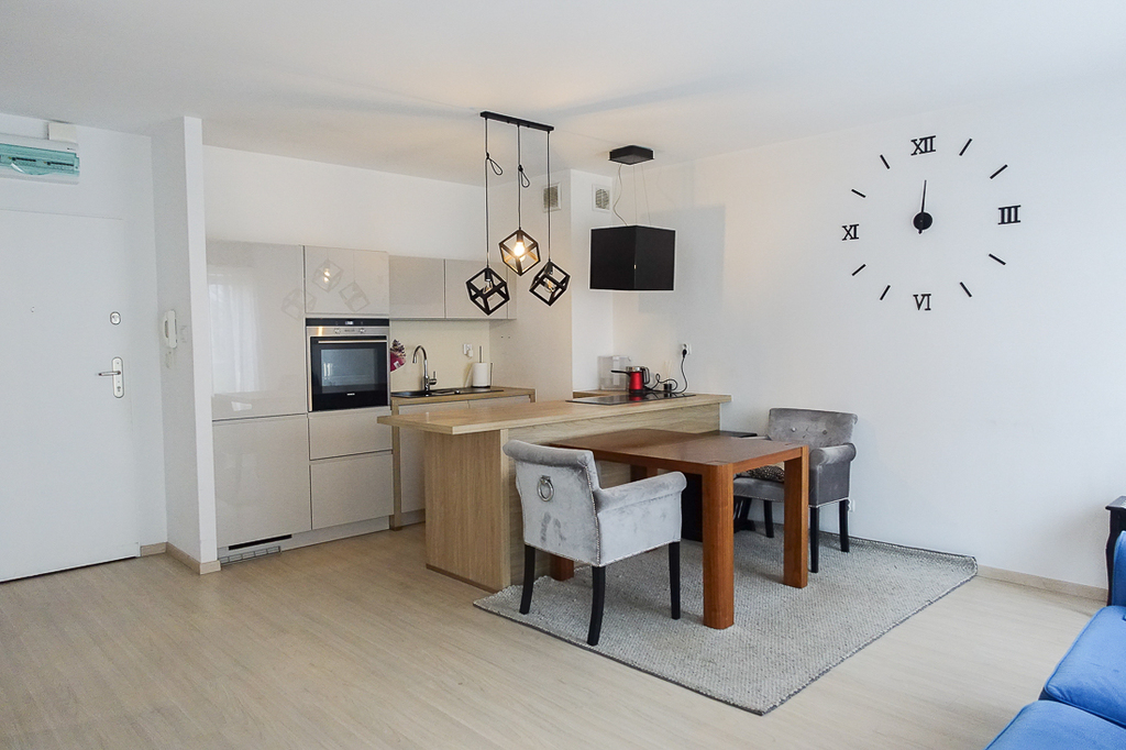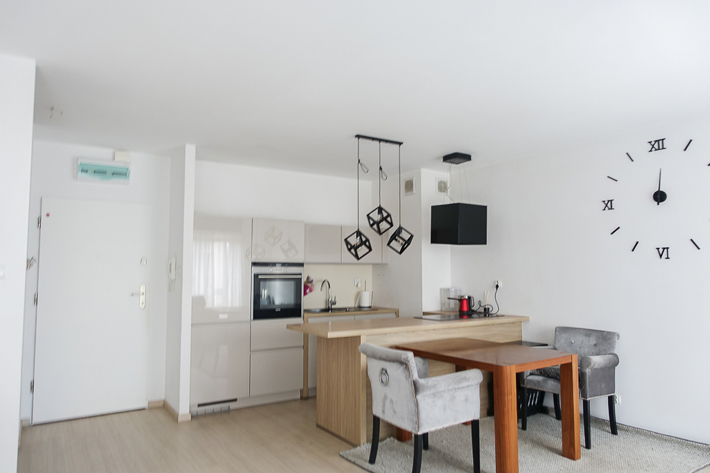 Część dzienną stanowi salon z aneksem kuchennym. Nowoczesna kuchnia w zabudowie, wyposażona (płyta indukcyjna, piekarnik elektryczny w zabudowie, zmywarka, okap z odprowadzeniem wentylacyjnym, lodówka). Pomiędzy pokojem, a aneksem kuchennym wyspa z szafkami i płytą indukcyjną. Z pokoju dziennego wyjście na wygodny, słoneczny balkon.