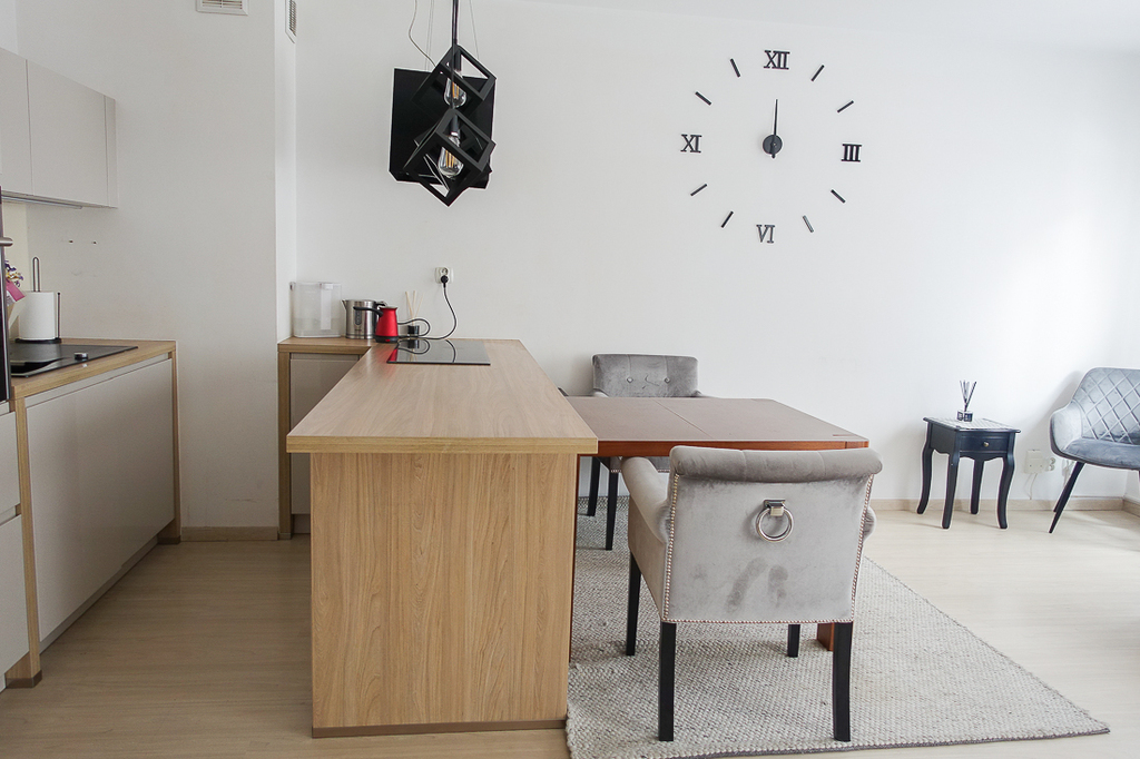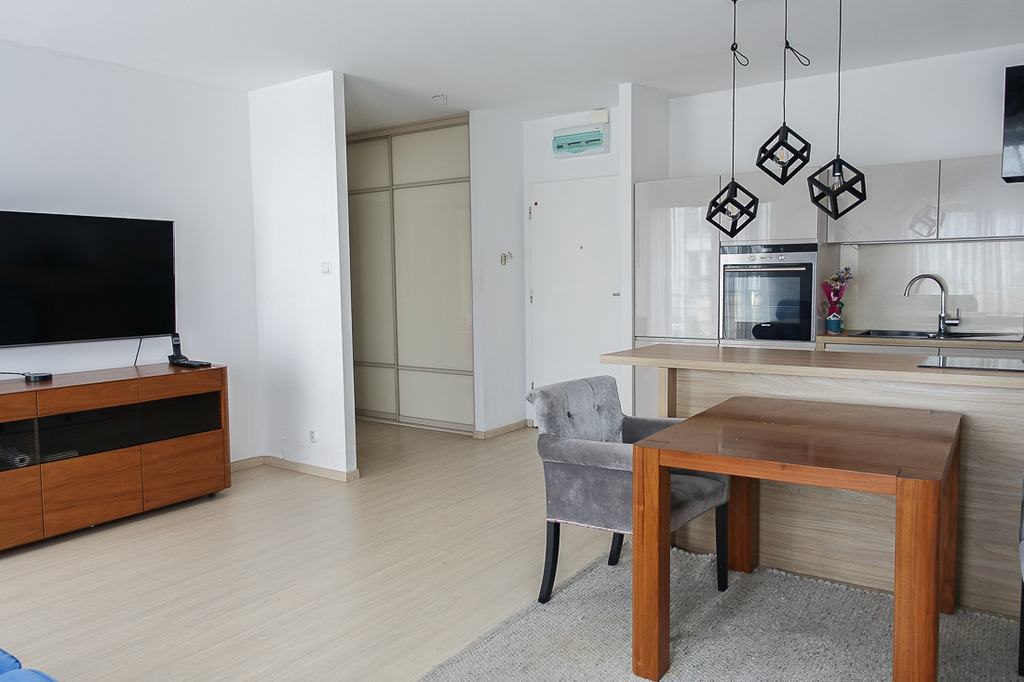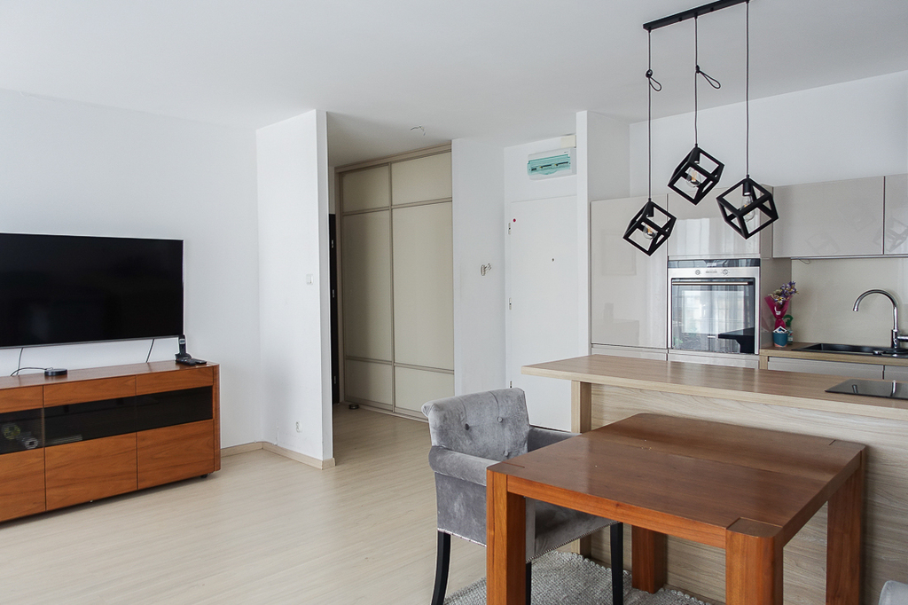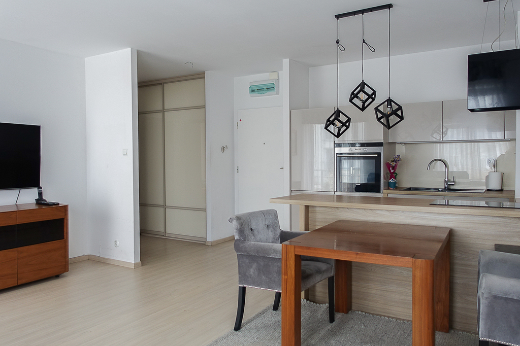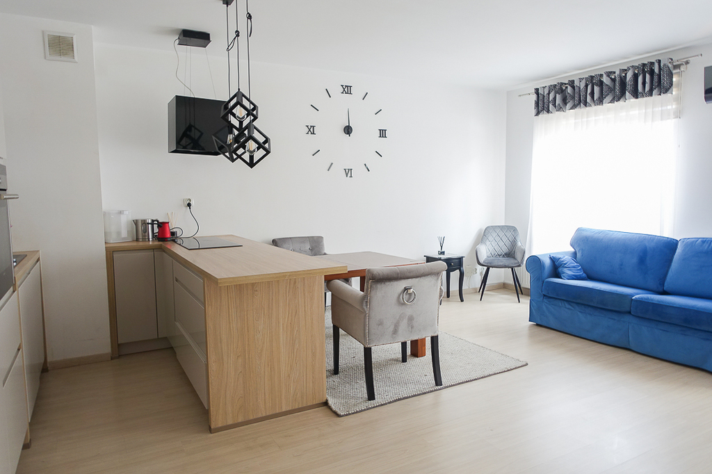 Część dzienną stanowi salon z aneksem kuchennym. Nowoczesna kuchnia w zabudowie, wyposażona (płyta indukcyjna, piekarnik elektryczny w zabudowie, zmywarka, okap z odprowadzeniem wentylacyjnym, lodówka). Pomiędzy pokojem, a aneksem kuchennym wyspa z szafkami i płytą indukcyjną. Z pokoju dziennego wyjście na wygodny, słoneczny balkon.