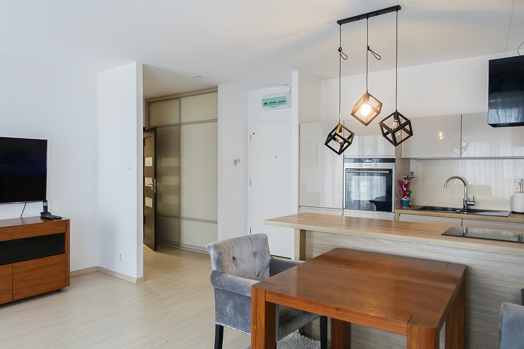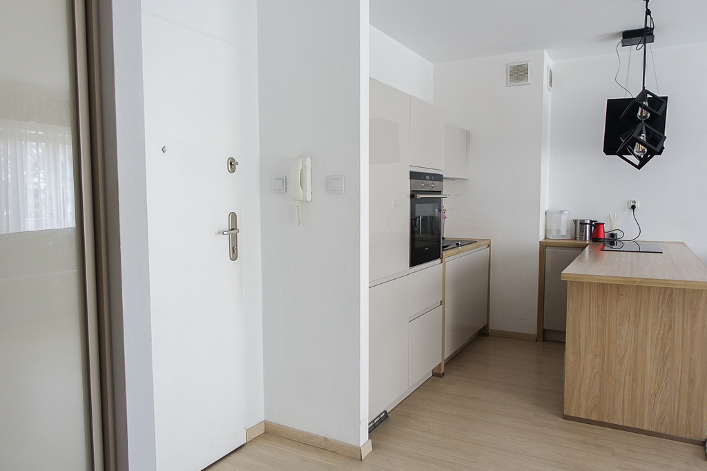 Kazimierska Street. 2 - room apartment with an area of 47.57 m2 with a balcony located in a low multi-family building on the 1st floor in Gumieńce in a 4-storey building with an elevator from 2016. Windows facing east. APARTMENT DESCRIPTION: Living room with kitchenette, total 20 m2, with access to a balcony with an area of 3.61 m2, bedroom with an area of 12 m2 with a large komandor type built-in unit (with frosted glass), bathroom with an area of 4 m2 with a shower cabin, washbasin with a cabinet, washing machine in tiles and terracotta, hall with built-in unit (wardrobe with frosted glass). The living area consists of a living room with kitchenette. Modern built-in kitchen, equipped (induction hob, built-in electric oven, dishwasher, hood with ventilation outlet, fridge). Between the room and the kitchenette there is an island with cabinets and an induction hob. From the living room there is an exit to a comfortable, sunny balcony. The location in relation to the cardinal directions makes the apartment beautifully lit with natural daylight. Bedroom - a regular room in the shape of a square with a practical, spacious built-in wardrobe. Bathroom in elegant tiles and terracotta. In the built-in there is a small electric dryer for laundry. Sale with permanent buildings. There is no gas in the building. The apartment has air conditioning. The rent is PLN 350, heating from SEC, additionally electricity. Dark door joinery, burglar-proof entrance door, PVC windows and balcony door. For an additional fee of PLN 15,000, a storage room with an area of 3.61 m2 and a convenient parking space in the underground garage for PLN 80,000, the storage room is next to the garage space. The garage is accessed by a lift from the apartment level. TOTAL PRICE IS 635,000 PLN. The apartment is cozy and comfortable, which is a very attractive offer for people looking for a comfortable place to live as well as for investment. Immediate delivery. If someone does not want a parking space, it is possible to buy just the apartment with a storage room.
