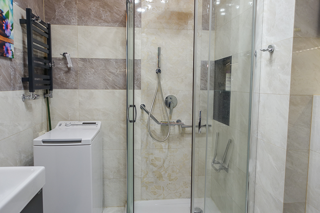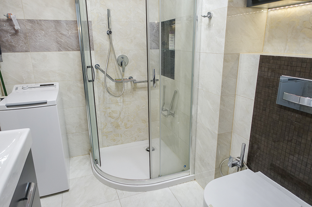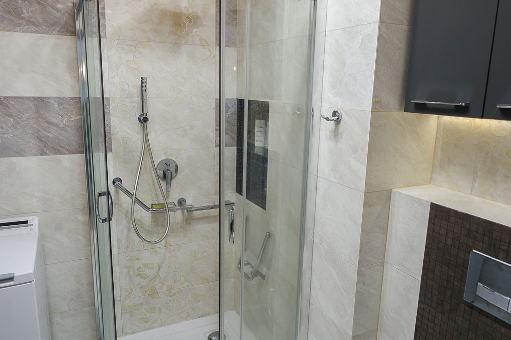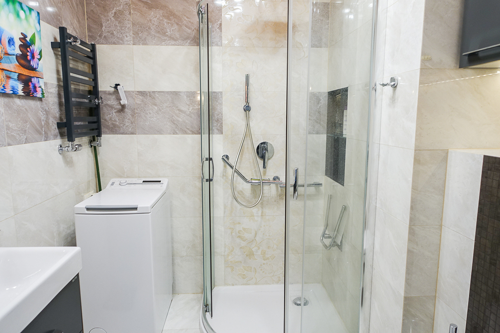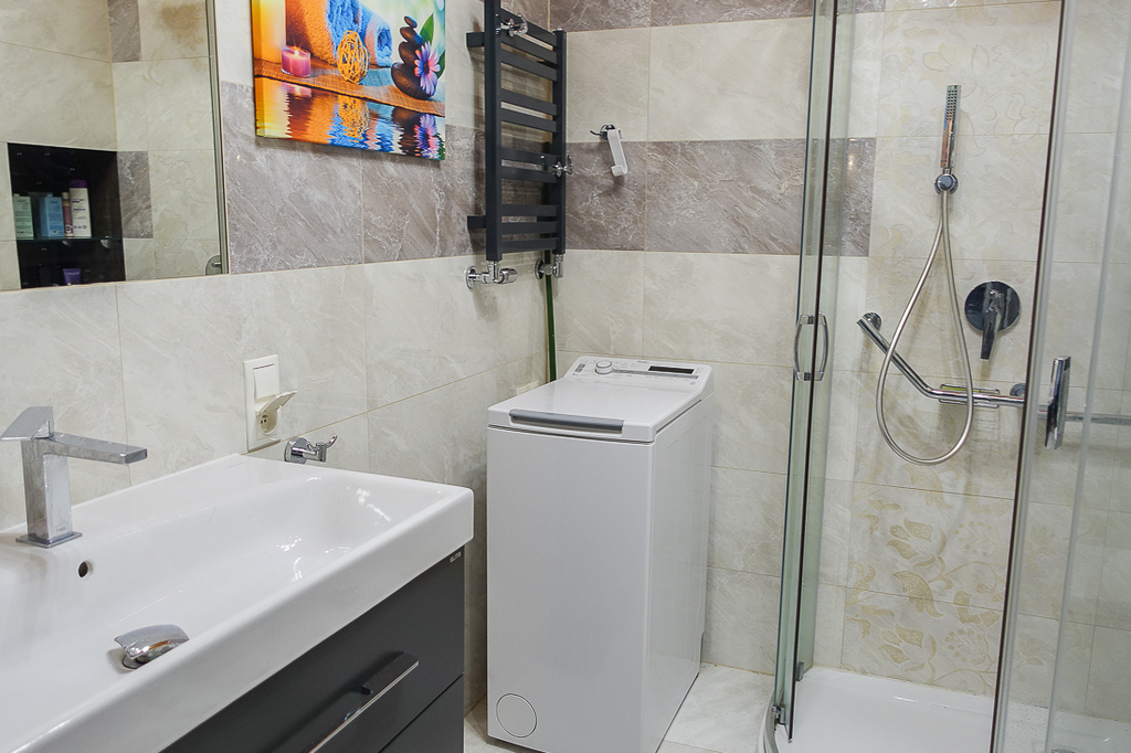 Łazienka w eleganckiej glazurze i terakocie. W zabudowie niewielka suszarka elektryczna na pranie. Sprzedaż wraz z zabudową stałą. W budynku nie ma gazu.