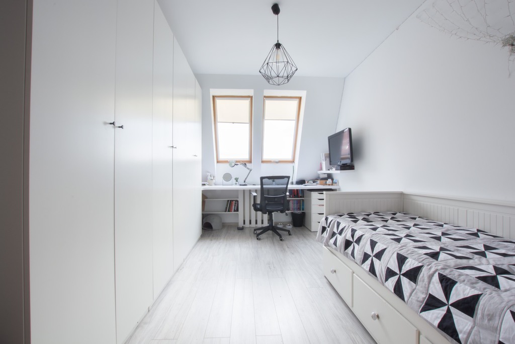 -prowadzą na niego drewniane schody, znajduje się na nim duża sypialnia z garderobą, przestronna łazienka z WC wyposażona w narożną wanną.