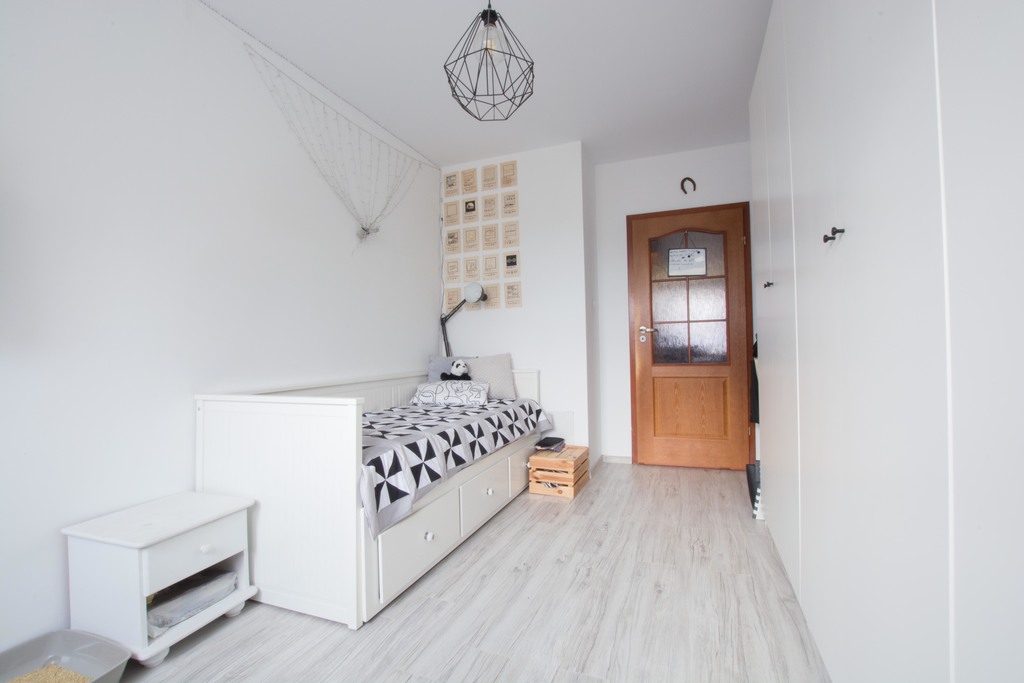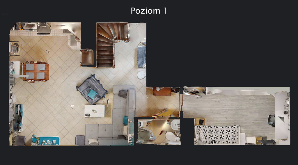 -duży salon z wyjściem na mały balkon, salon połączony z kuchnią w aneksie kuchennym, meble na wymiar wraz ze sprzętem AGD (okap, zmywarka 60cm, płyta grzewcza elektryczna, piekarnik), na tym poziomie znajduje się również sypialnia oraz pierwsza łazienka wyposażona w kabinę prysznicową, przedpokój z zabudową szafą pod schodami.