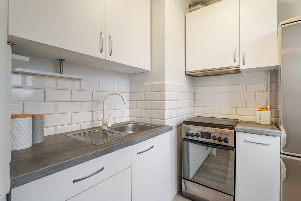 Mieszkanie o powierzchni 24,2 m² znajduje się na pierwszym piętrze niskiego bloku i składa się z: