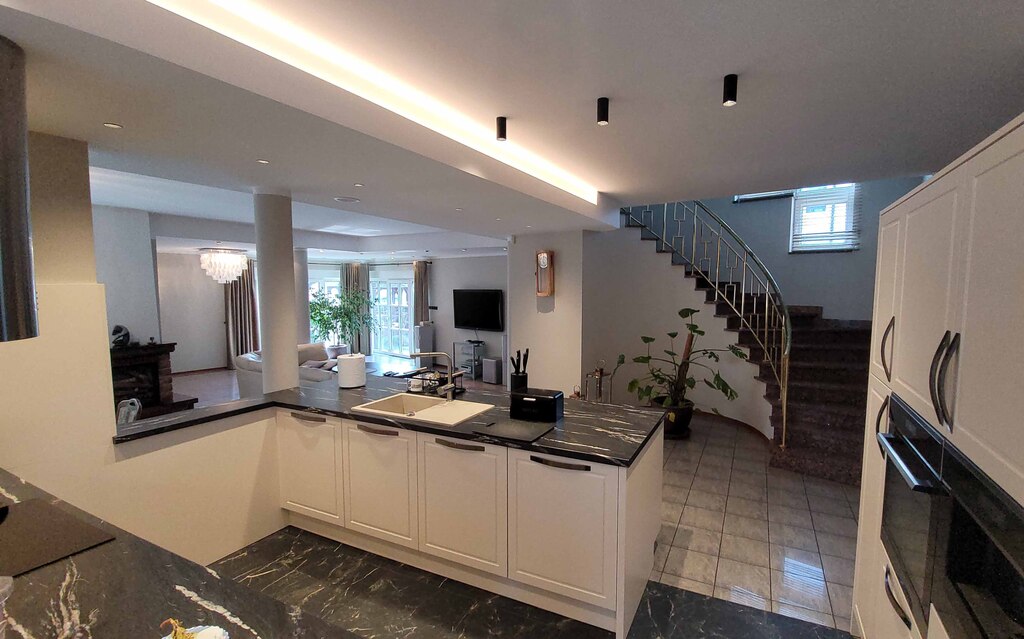 W całym domu znajdują się liczne punkty świetlne, w tym unikalne żyrandole z ciętego kryształu. Na podłogach położono wysokiej jakości kafle, a ściany zostały wygładzone i starannie pomalowane. Szerokie, granitowe schody z mosiężnymi wykończeniami prowadzą na piętro. Dodatkowo salon oraz główna sypialnia są klimatyzowane.