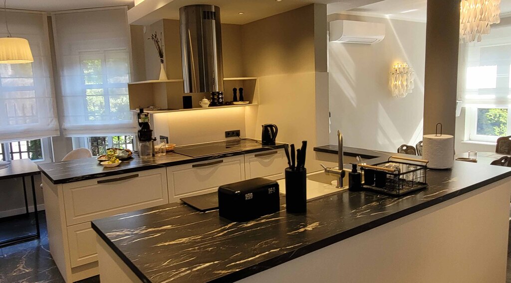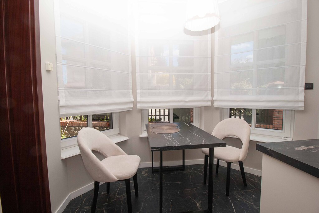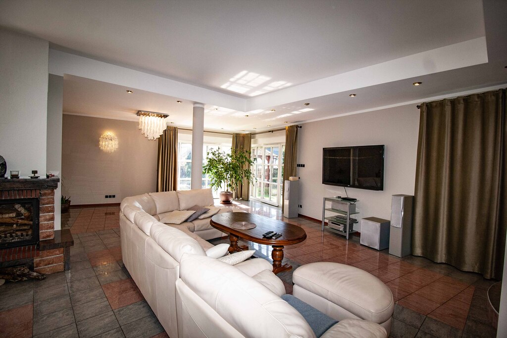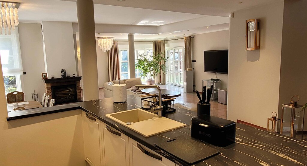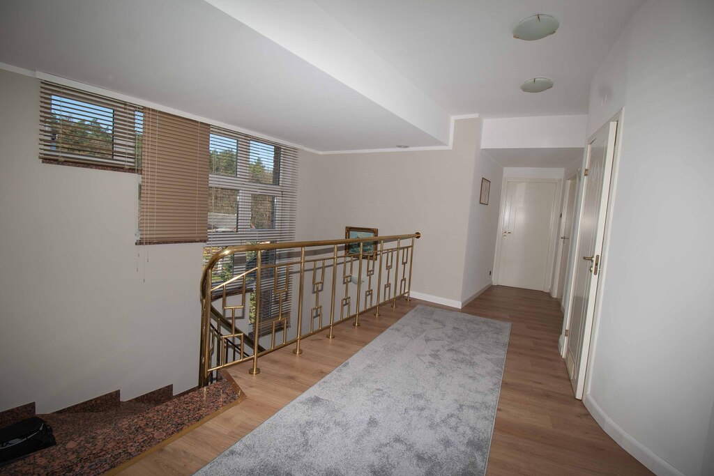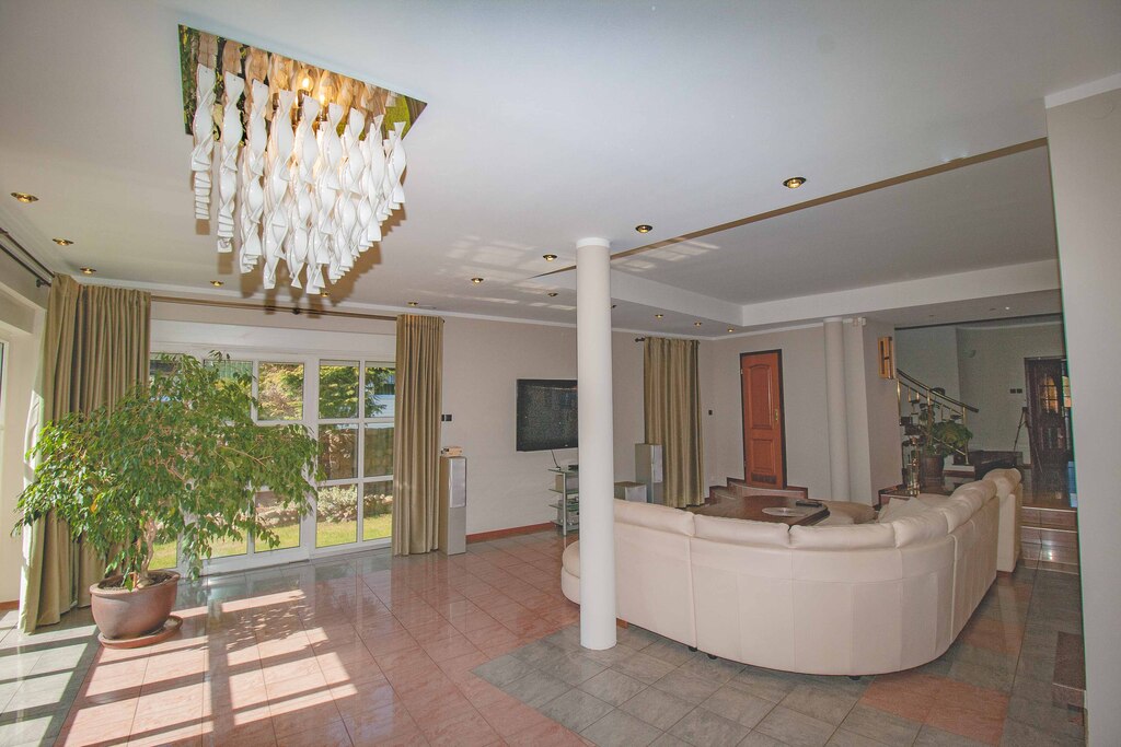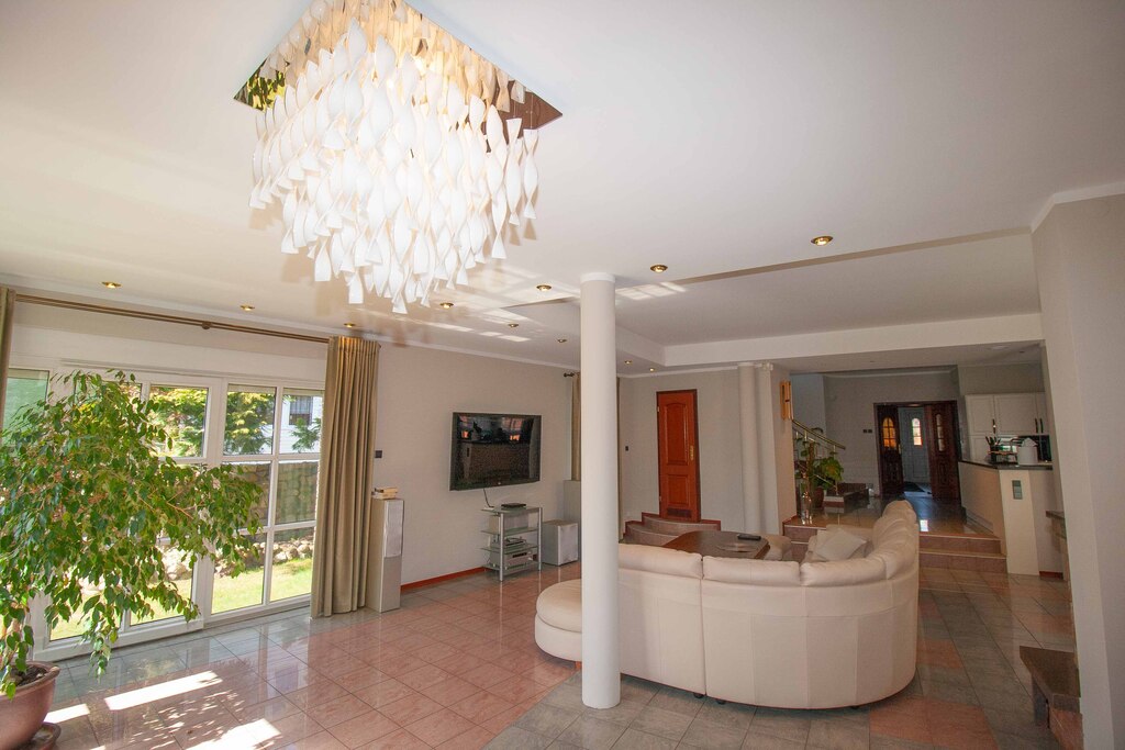 Dom został zaprojektowany i wykończony z pomocą architekta przy użyciu najwyższej jakości materiałów. Wnętrza urządzono ze smakiem i dużą dbałością o detale – oświetlenie, armatura łazienkowa oraz elementy dekoracyjne zostały sprowadzone z Hiszpanii, Włoch i Niemiec. Zasłony wykonane są z jedwabiu, a całe widoczne na zdjęciach wyposażenie może pozostać w cenie nieruchomości.