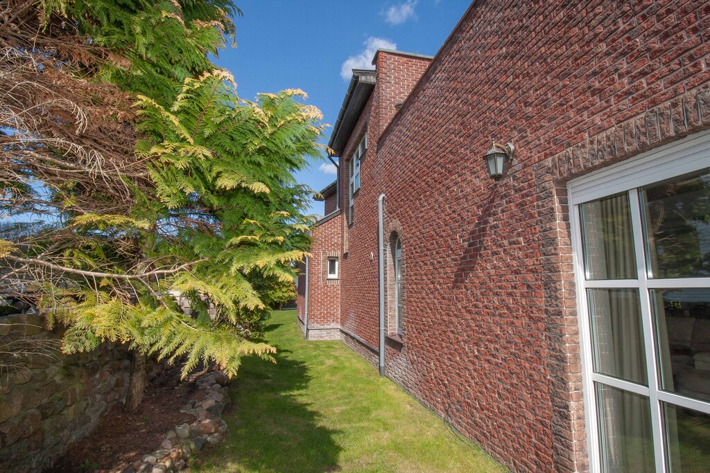 Działka została starannie zagospodarowana – liczne nasadzenia, szpaler wysokich tui, ozdobne krzewy, solidne murowano-kamienne ogrodzenie. W tylnej części posesji znajduje się altanka oraz wydzielone miejsce na grilla.