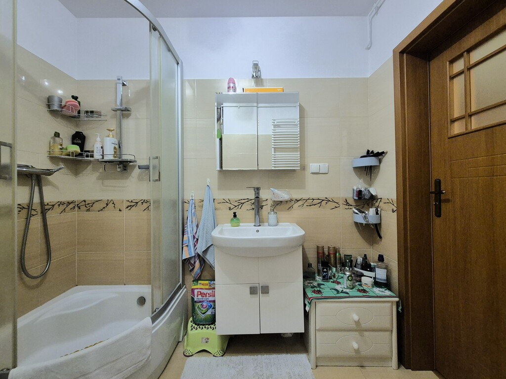 * duża łazienka z kabiną prysznicową, podtynkowym WC, umywalką i pralką