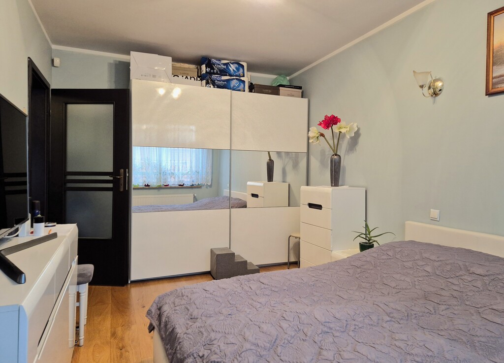 * sypialnia z podwójnym łóżkiem, pojemną szafą i komodą