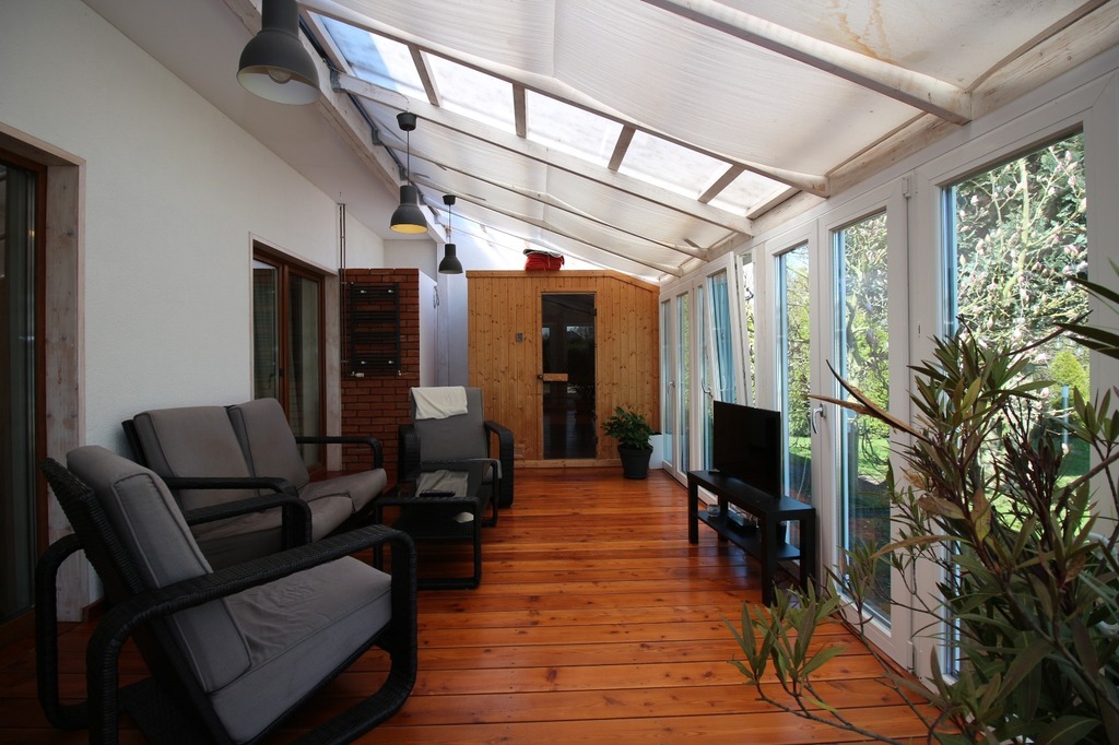 • Ogród zimowy z sauną – idealne miejsce na odpoczynek niezależnie od pory roku