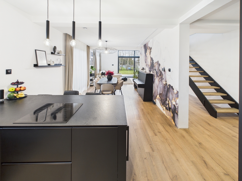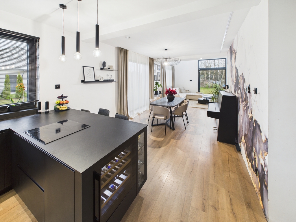 Dom wykończony w najwyższym standardzie z dbałością o każdy detal, Designerska kuchnia wyposażona w lodówki na wino oraz granitowe blaty .