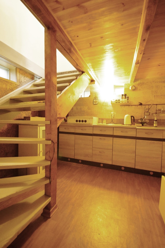 - Pokój dzienny 36 m2 z pokoju zejście drewnianymi schodami na parter.