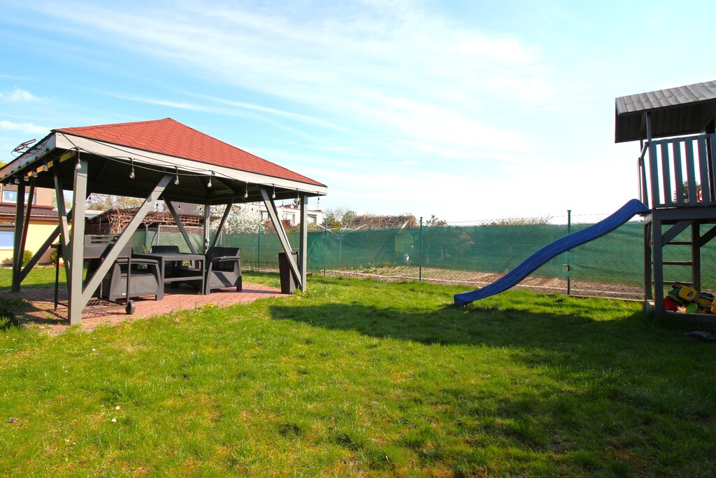 Działka o powierzchni ok 180m2 z drewnianą altaną i domkiem zabaw dla dzieci