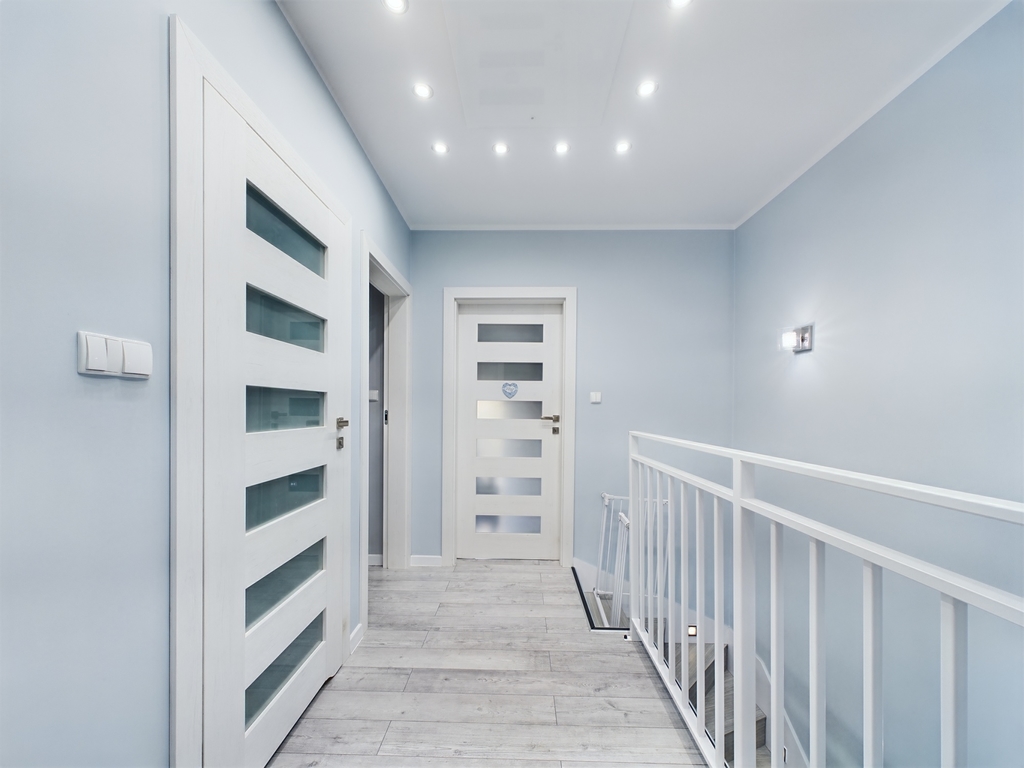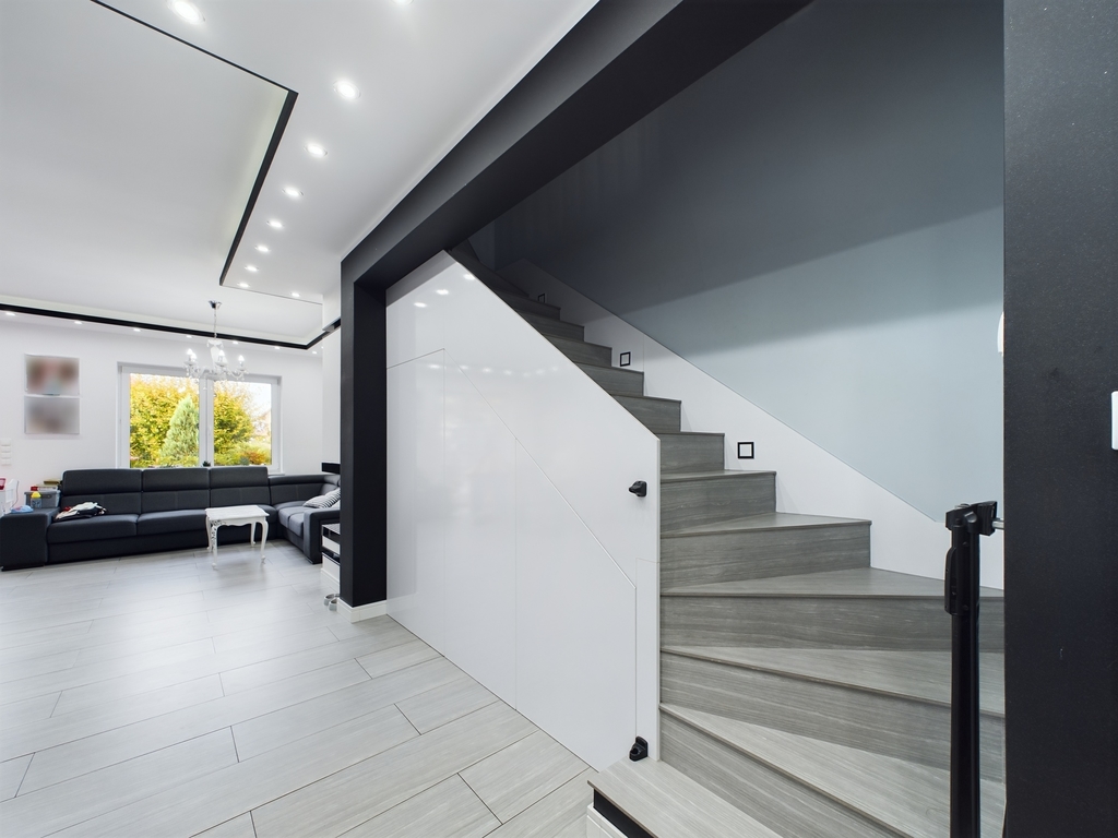 - schody prowadzące na piętro z zabudowanymi szafkami pod spodem