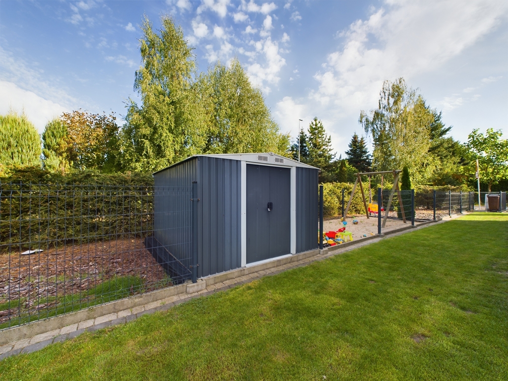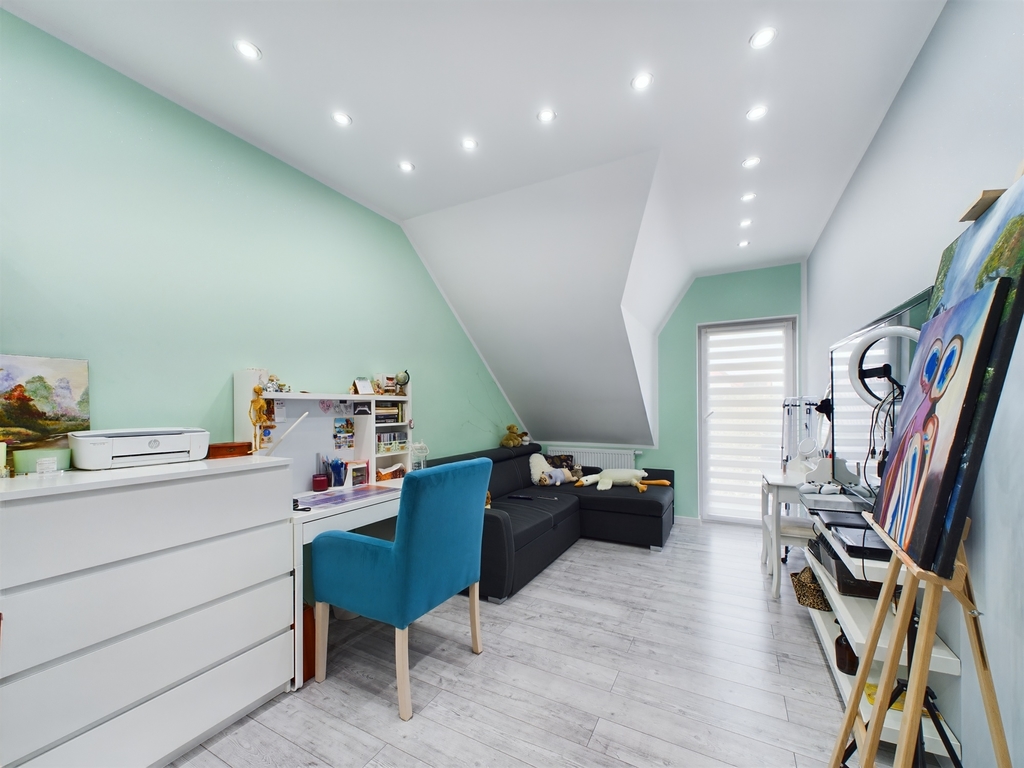Dom został wybudowany w 2018 r. z Porothermu. Na działce w kształcie prostokąta o powierzchni 218 m2. Ogrodzony z bramą wjazdową otwieraną na pilota. Ogródek pięknie urządzony z drzewkami, tarasem, szopką oraz placem zabaw.