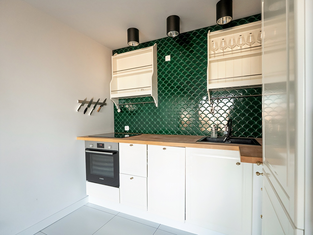 - Kuchnia: Otwarta, w zabudowie, z drewnianym blatem, wyposażona w sprzęt AGD renomowanych marek: