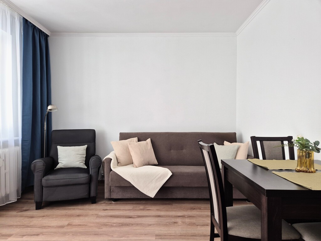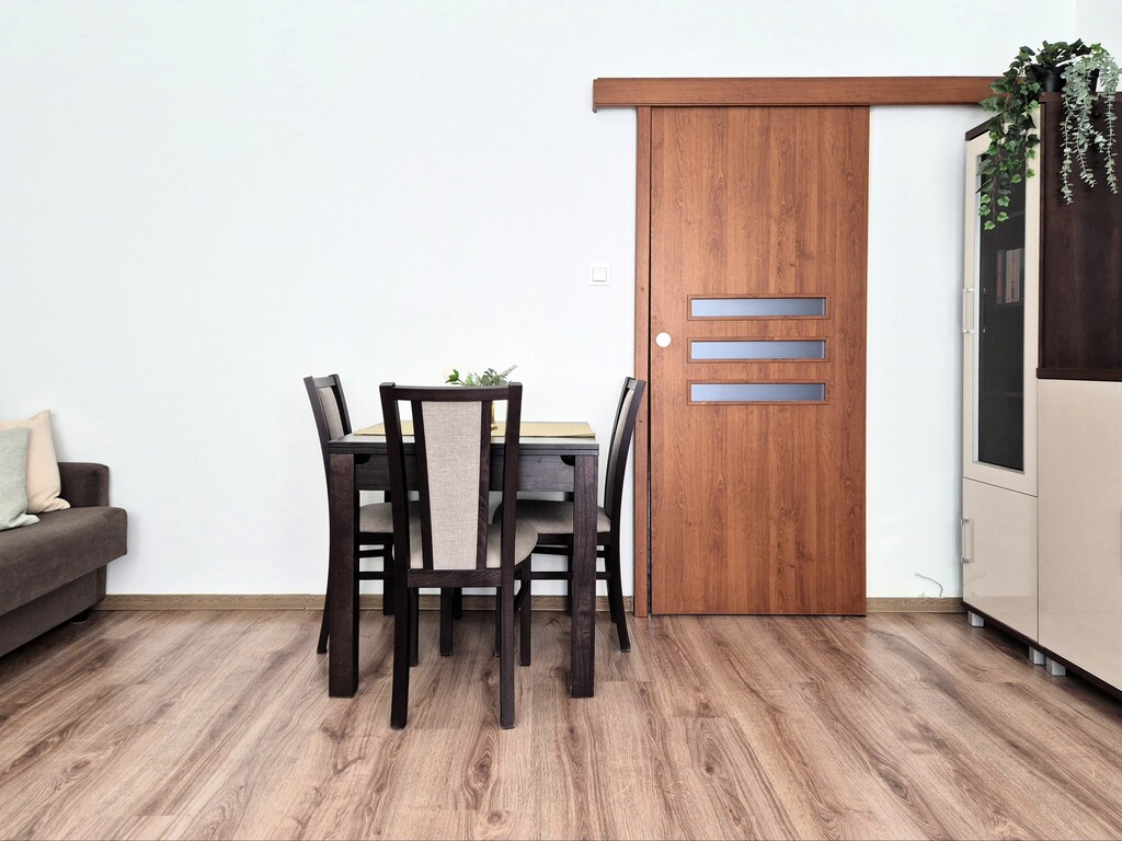 * salon wyposażony w rozkładaną kanapę, fotel, komody oraz stół z krzesłami