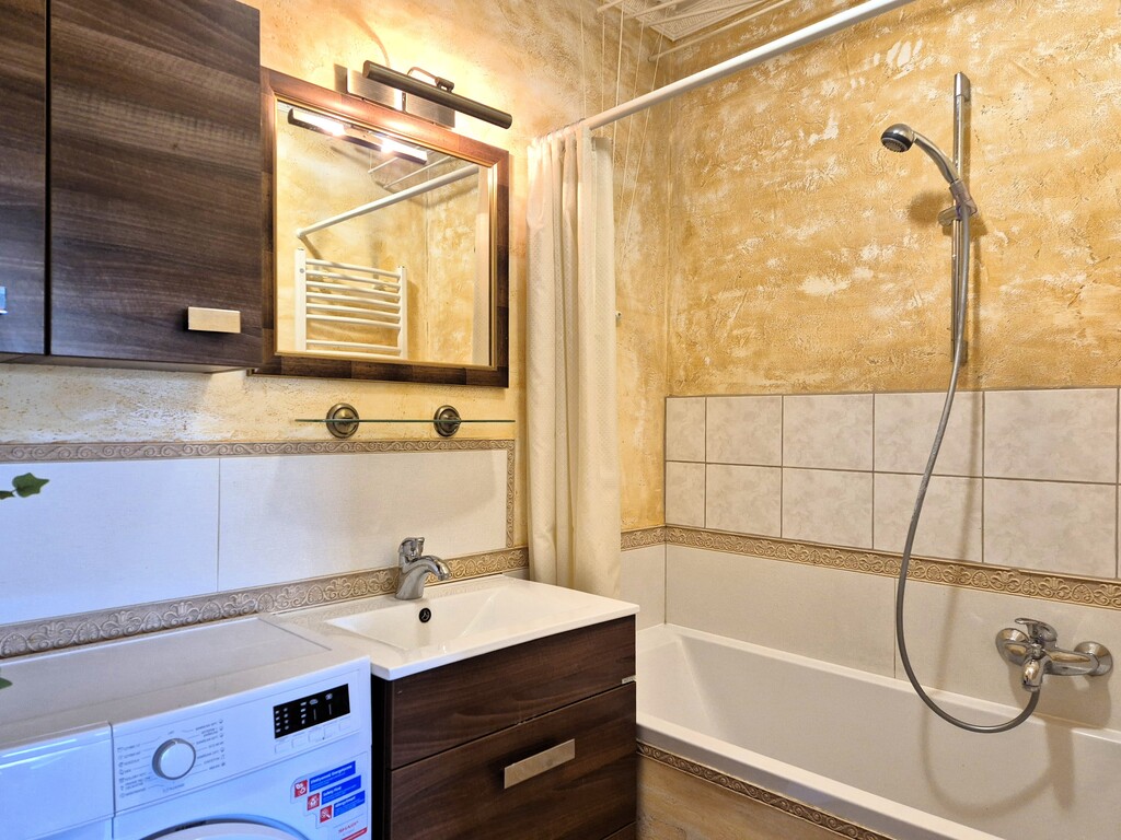 * łazienka z wanną, umywalką i pralką, osobne WC