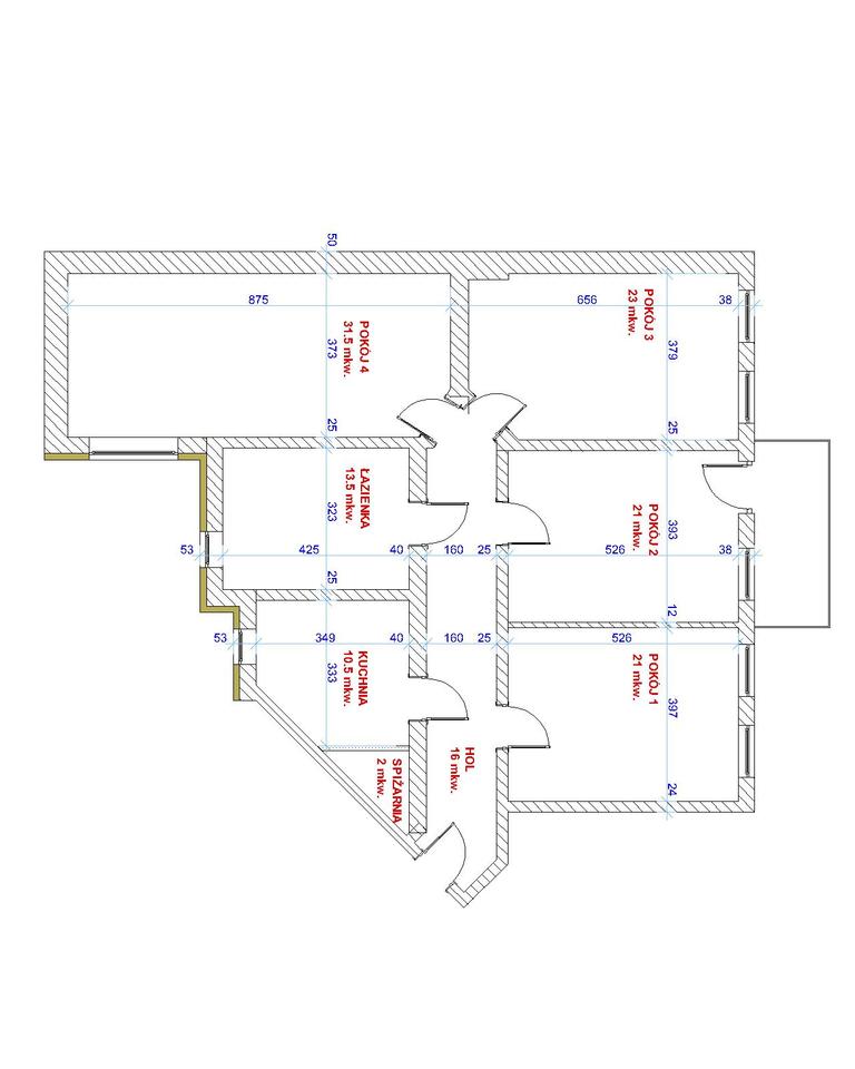 Mieszkanie składa się z 4 rozkładowych pokoi o powierzchniach 31,50m2, 23m2, 21m2, 21m2 . Jeden z pokoi posiada balkon. Wszystkie pomieszczenia są nieumeblowane. Dodatkowo w mieszkaniu spora kuchnia 10,50m2 (wyposażona w dużą lodówkę z zamrażarką, zmywarkę, elektryczną kuchenkę 4-palnikową z piekarnikiem) i łazienka 13,50m2 (wyposażona w wannę z możliwością prysznica, bidet i umywalkę oraz przyłącze na pralkę). Wszystkie pomieszczenia połączone korytarzem 16m2.