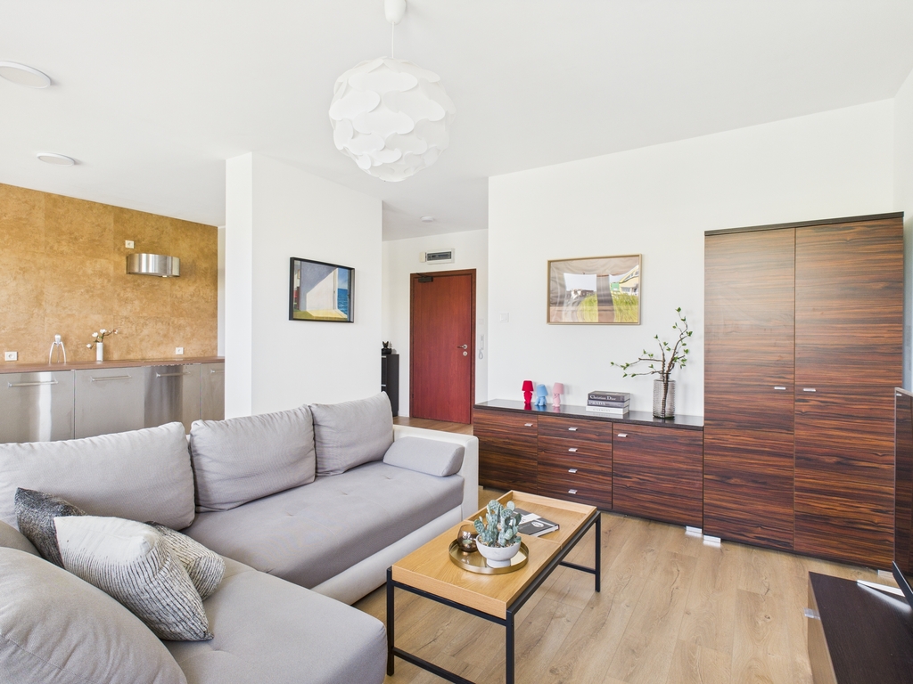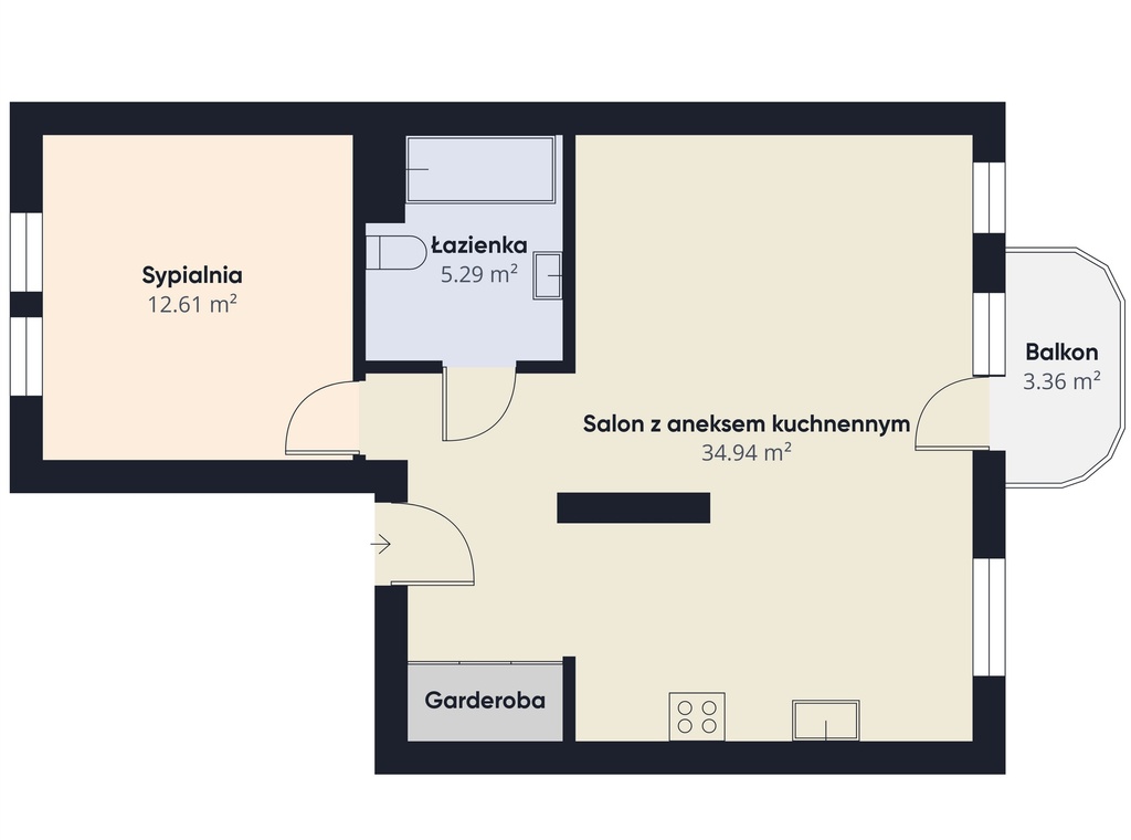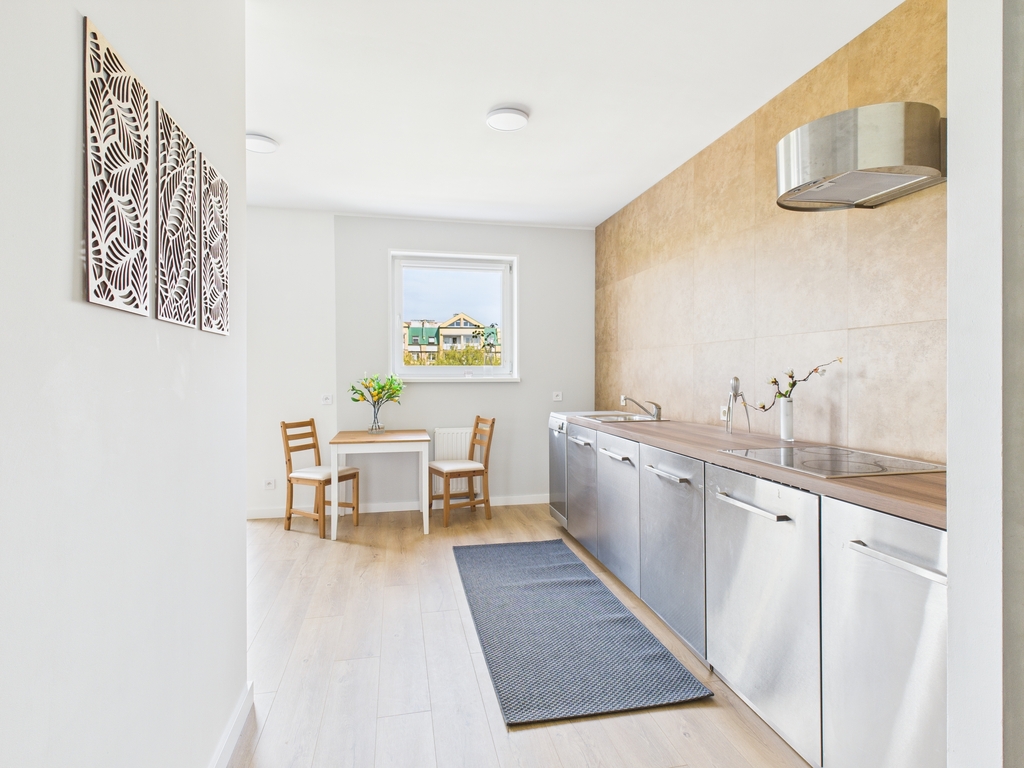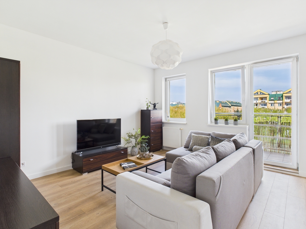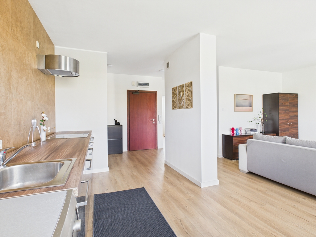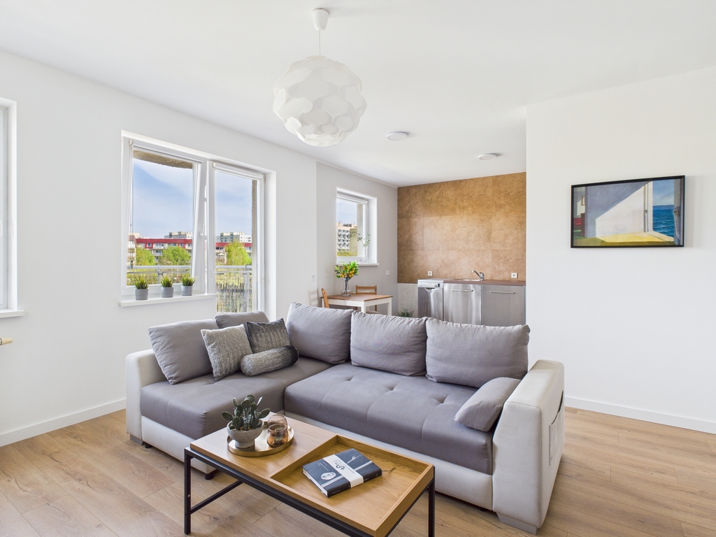 - Salon z aneksem kuchennym z wyjściem na balkon.