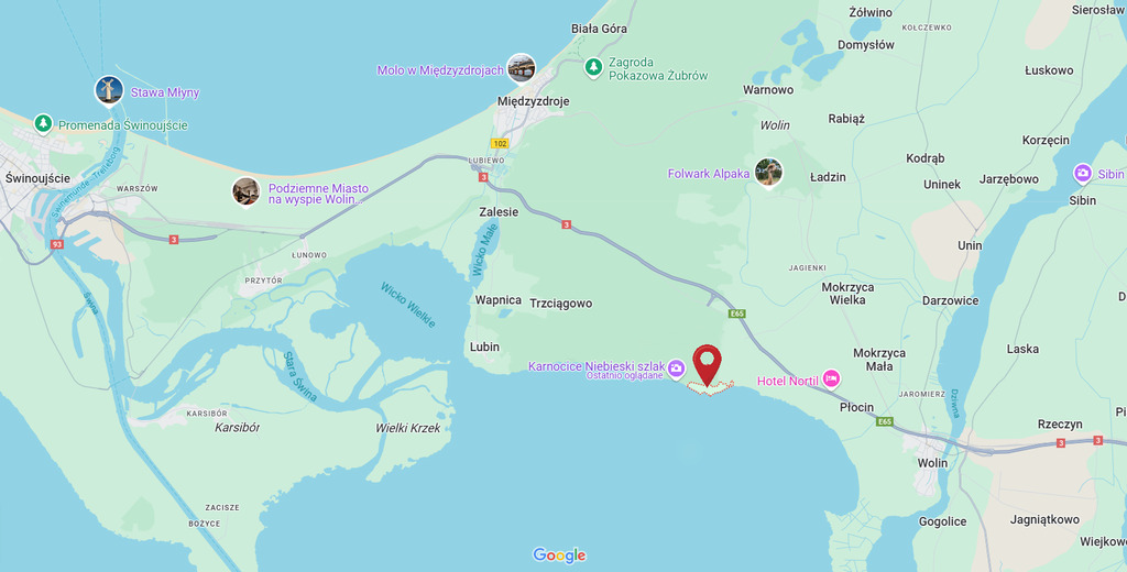 Działka położona jest poza obszarem szczególnego zagrożenia powodzią na lekkim wzniesieniu, do brzegu zalewu prowadzi wchodzącą w metraż działki droga o długości około 70m i szerokości 4 m z własną linią brzegową i możliwością utworzenia małej ok 10m plaży. Umożliwia to uprawianie sportów wodnych, wędkowania itp. Stąd też nieregularny kształt działki. W okolicy trasy rowerowe, szlaki turystyczne wiodące przez Woliński Park Narodowy aż do wybrzeża Bałtyku. Dojazd do nadmorskich plaż drogą S3 zajmuje zaledwie kilkanaście minut.