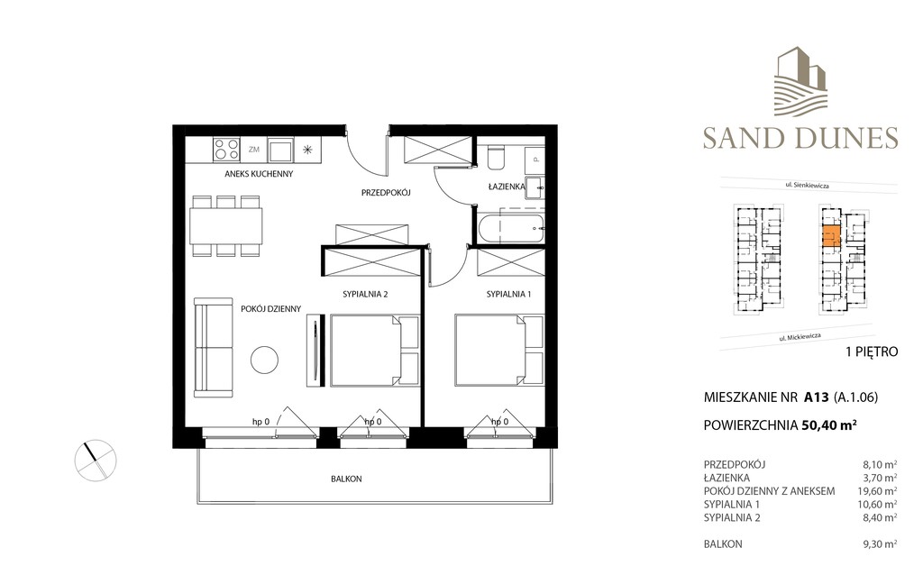Apartament 3 pokojowy o powierzchni 50,33 m2 w budynku położonym nad morzem w pierwszej linii od plaży. Pokój dzienny z aneksem kuchennym 19,6 m2, sypialnia 10,6 m2 oraz 8,4 m2. Przedpokój 8,1 m2. Łazienka 3,7 m2. Balkon 9,3 m2. I piętro. Sand Dunes w Dziwnowie to kameralna inwestycja obejmująca dwa budynki o wyjątkowej architekturze położone w idealnej lokalizacji, w pierwszej linii zabudowy, z widokiem na Morze Bałtyckie z jednej strony oraz rzekę Dziwną i Zatokę Wrzosowską z drugiej. Inwestycja oddalona jest od morza jedynie o 60 m, a zejście na plażę bezpośrednio z terenu inwestycji spełni oczekiwania najbardziej wymagających Klientów. Możliwość wykończenia na życzenie klientów i zarządzanie najmem. W garażu podziemnym stacje do ładowania samochodów elektrycznych. Zjazd do garażu windą. Cena miejsca postojowego 80.000 zł.