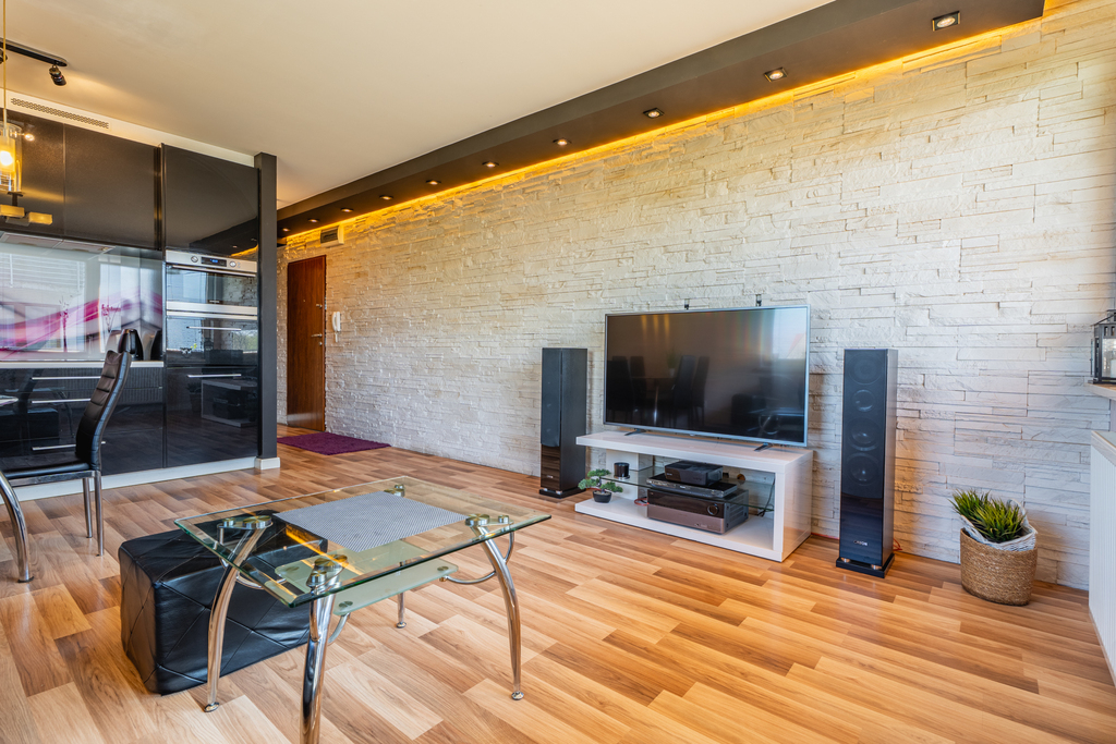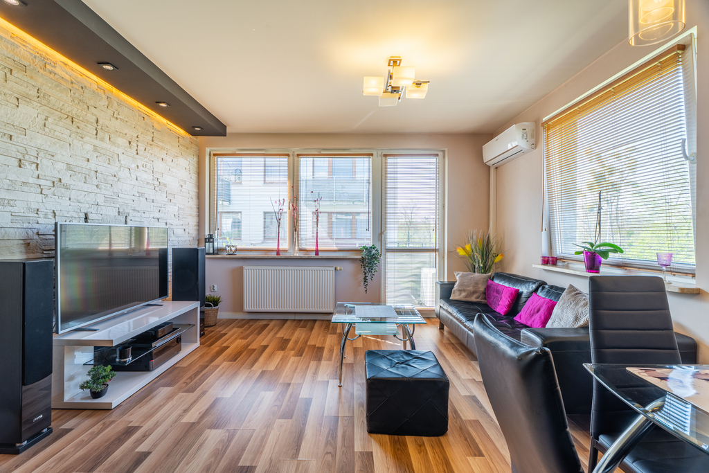 Ekspozycja: Salon usytuowany jest od strony południowo-zachodniej, co sprawia że mamy w mieszkaniu dużo naturalnego światła przez cały dzień. Dodatkowo takie nasłonecznione pomieszczenia są naturalnie docieplane.