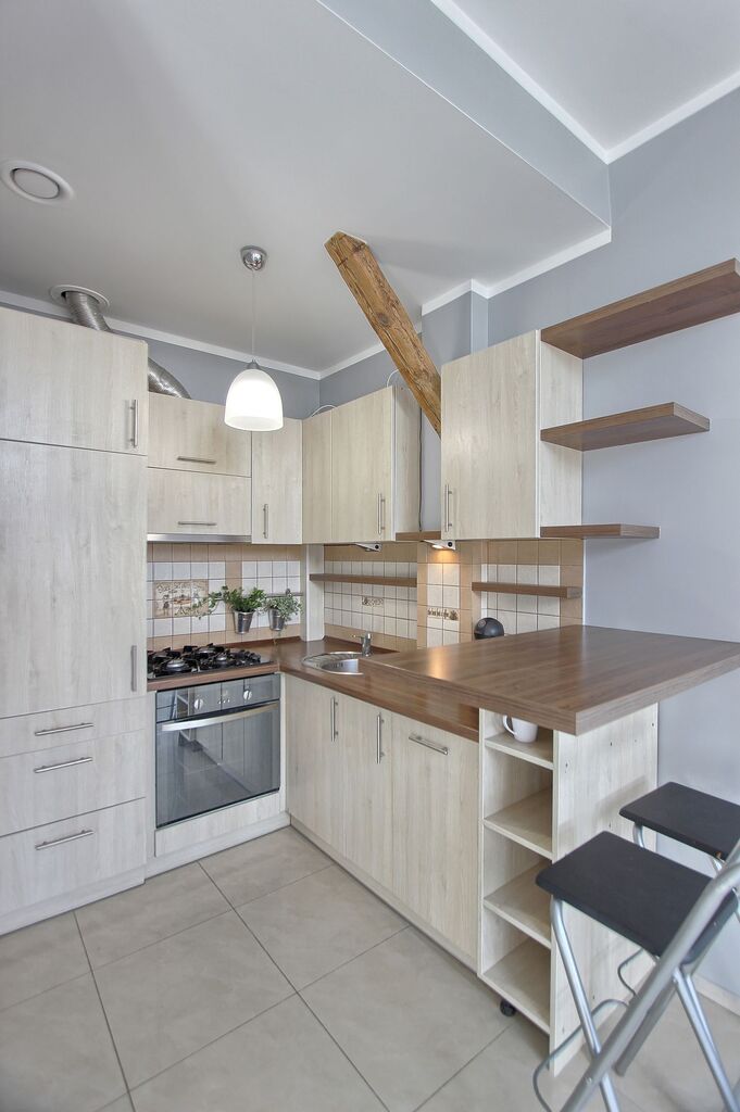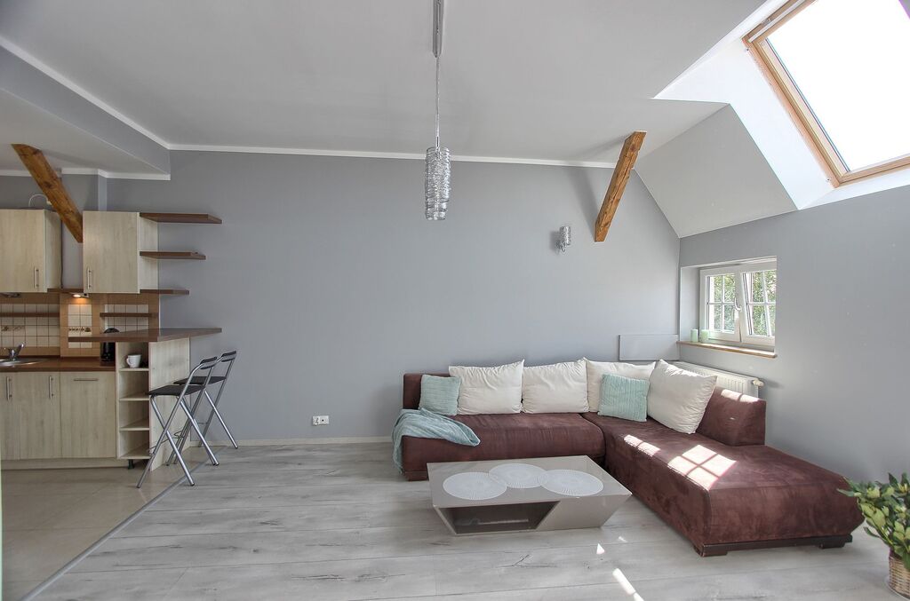 - salon z aneksem kuchennym - z meblami w zabudowie i sprzętem AGD - zmywarka, okap, lodówka z zamrażarką, kuchenka gazowa, piekarnik, czajnik, ekspres do kawy.