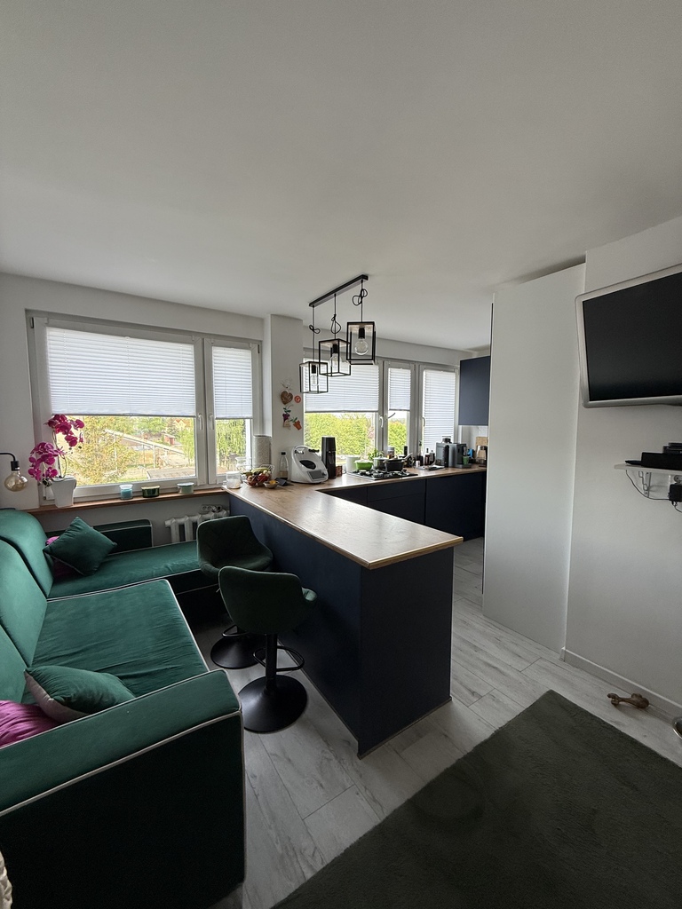 Salon z aneksem kuchennym – przestrzeń została otwarta poprzez wyburzenie ściany, co zapewnia większy komfort użytkowania i lepsze doświetlenie wnętrza