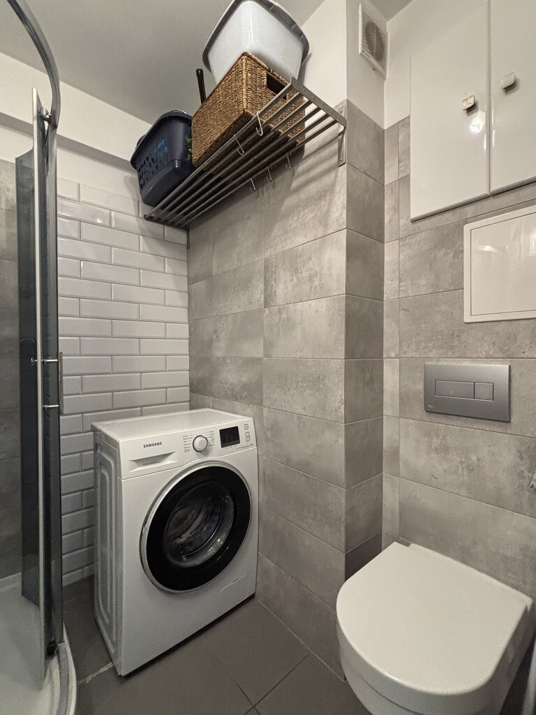 Łazienka z toaletą wykończona glazurą i terakotą. Na wyposażeniu kabina prysznicowa, umywalka, szafka, pralka.
